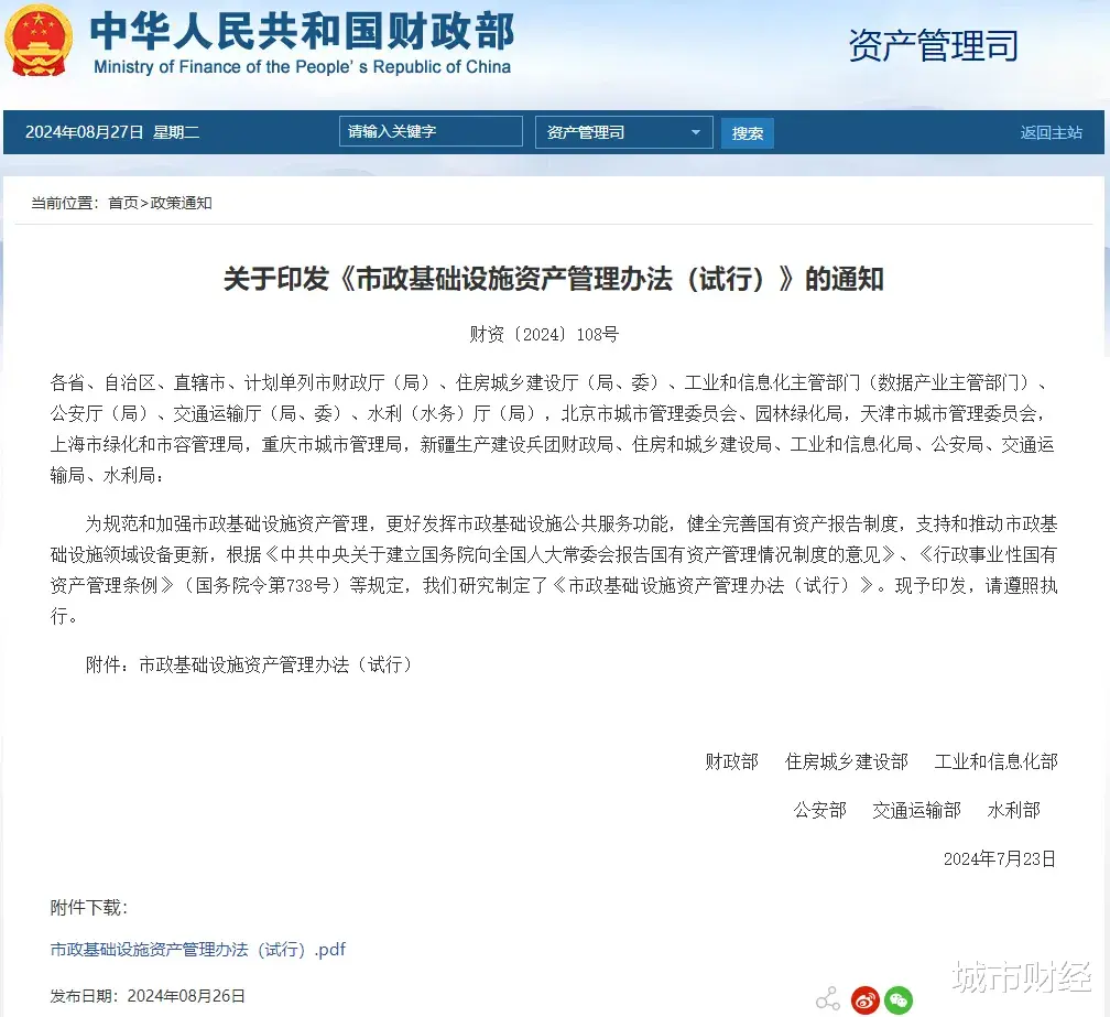 于是,2024年8月26日,财政部、住建部、工信部、公安部、交通部、水利部联合发布了《市政基础设施资产管理办法(试行)》的通知。