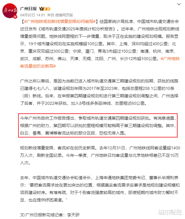 广州日报的意思是,四期可以获批的里程稍高于三期被砍的里程,预估可能在六七十公里。