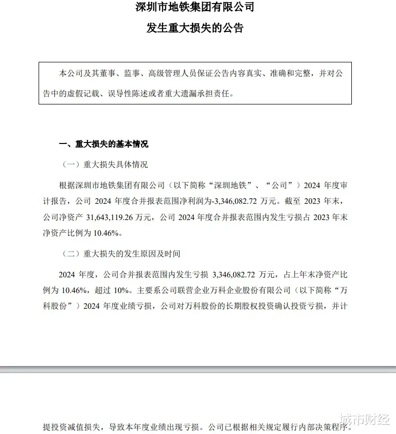 截至2024年末,深铁集团合并报表范围内发生亏损334.6亿元,占上年末净资产比例为10.46%,超过10%。