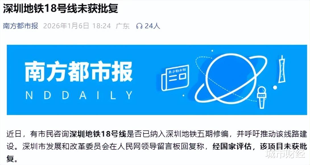 1月份,南方都市报爆料,有市民咨询深圳地铁18号线规划情况,官方给出的回复是,这条连接宝安、光明、龙华、龙岗、盐田等区的重要线路,经国家评估未获批复。