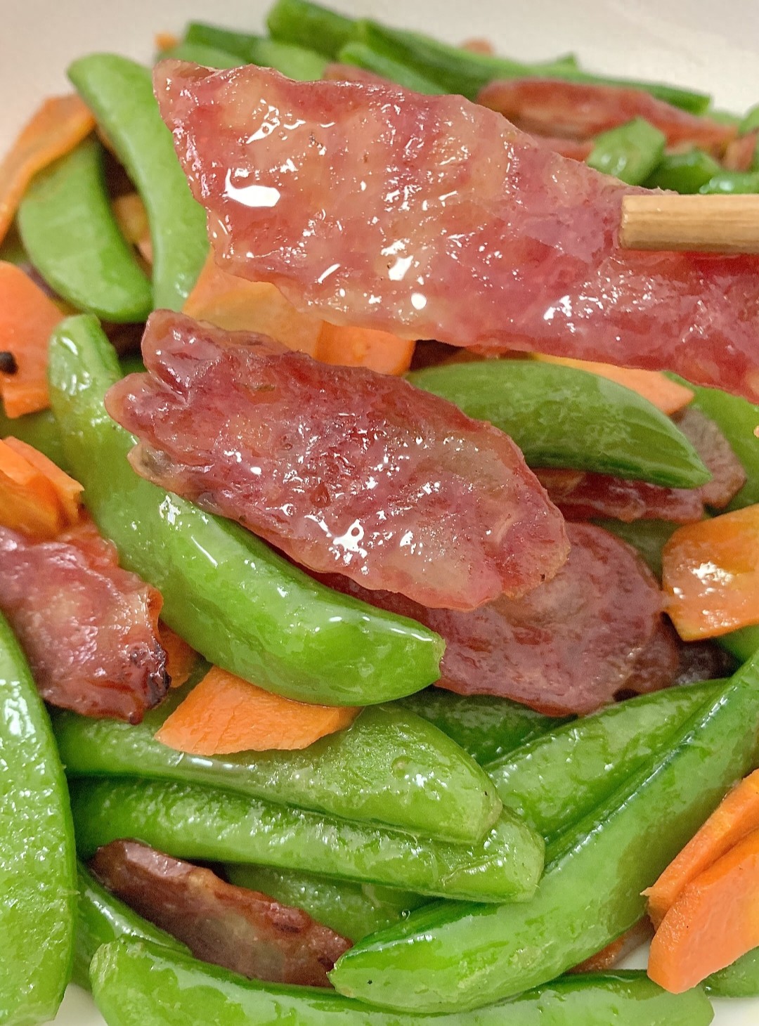 3. 炒制顺序很重要——锅热后直接放腊肠,小火煸出油脂,再用这些油爆香蒜片。腊肠的油渗透进荷兰豆,比任何食用油都香!