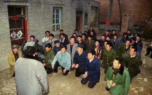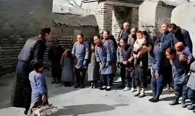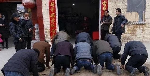 除了作揖说祝福的话以外,还会给老一辈人跪着磕头,照片中就是一群小辈结对而行去老一辈家中拜年的场景。