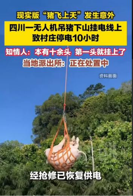 2026年1月24日凌晨,四川巴中通江县铁佛镇一村民尝试用无人机吊运年猪下山宰杀,不料在吊运第一头猪时,无人机连同年猪一起挂到高压线上。现场人员多次尝试救援和处置均未成功,事故导致线路短路,造成该村停电十小时,经供电部门紧急抢修才恢复供电。
