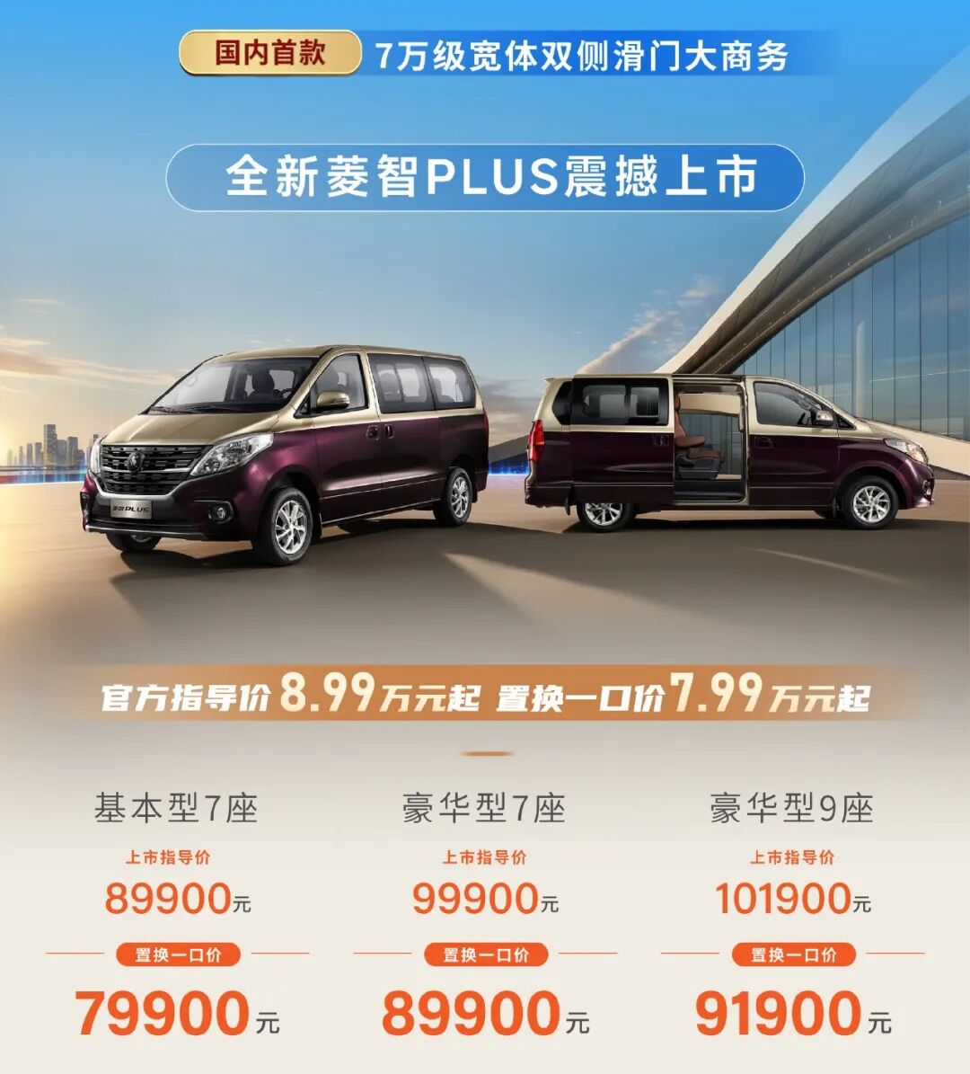 而3月18日刚上市的2027款菱智PLUS更让菱智家族的“创富神车”形象更上一层楼!目前2027款菱智PLUS已正式上市,新车分别推出基本型7座、豪华型7座、豪华型9座共三款车型可选,置换一口价格做到7.99万元起!8万不到的价格便可买到在颜值、空间、动力、安全等方面都在线的宽体双侧滑门大商务MPV,精准击中新时代中小微奋斗者的真实用车需求,可以说2027款菱智PLUS 会是你创业路上的好伙伴!