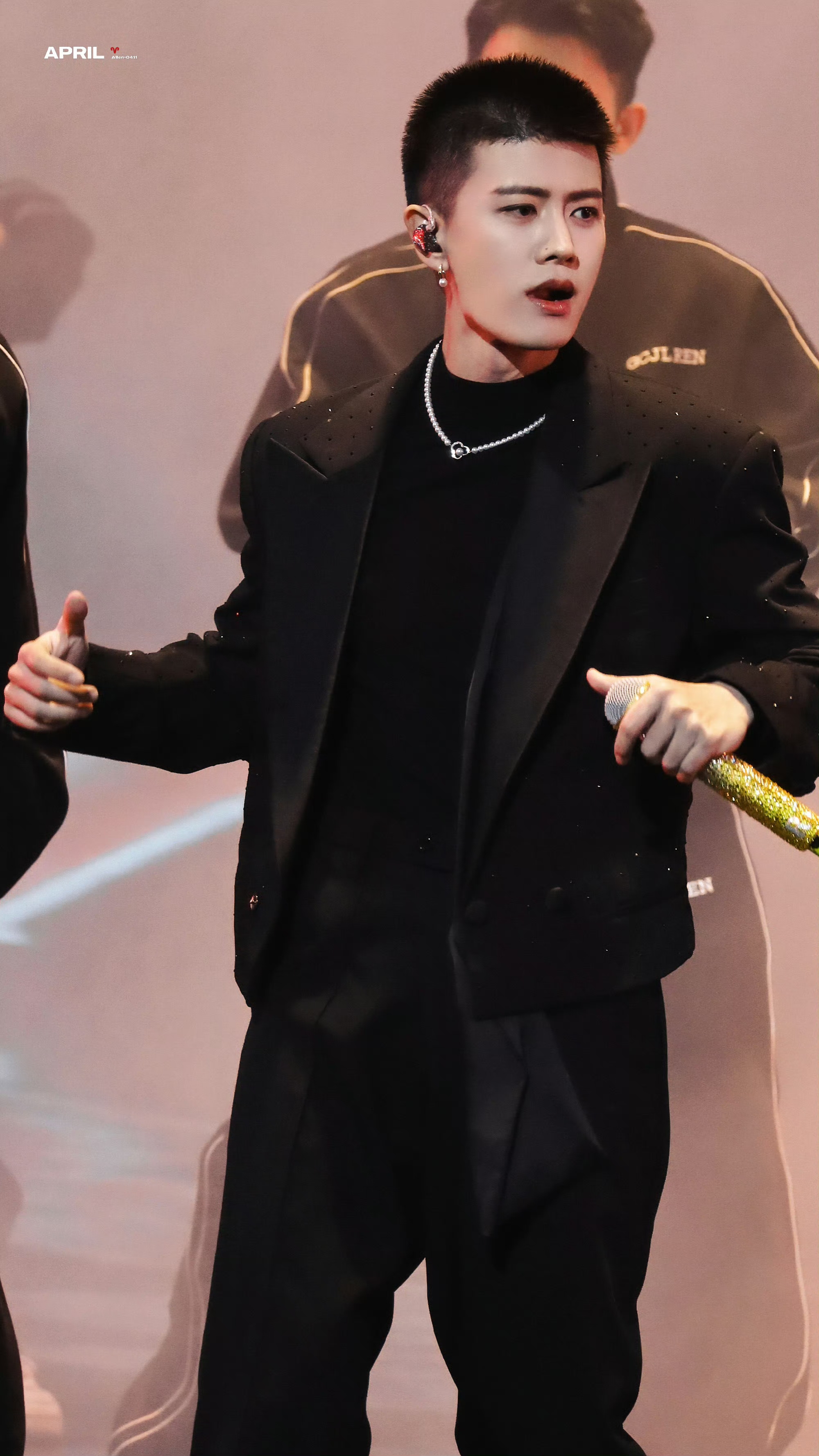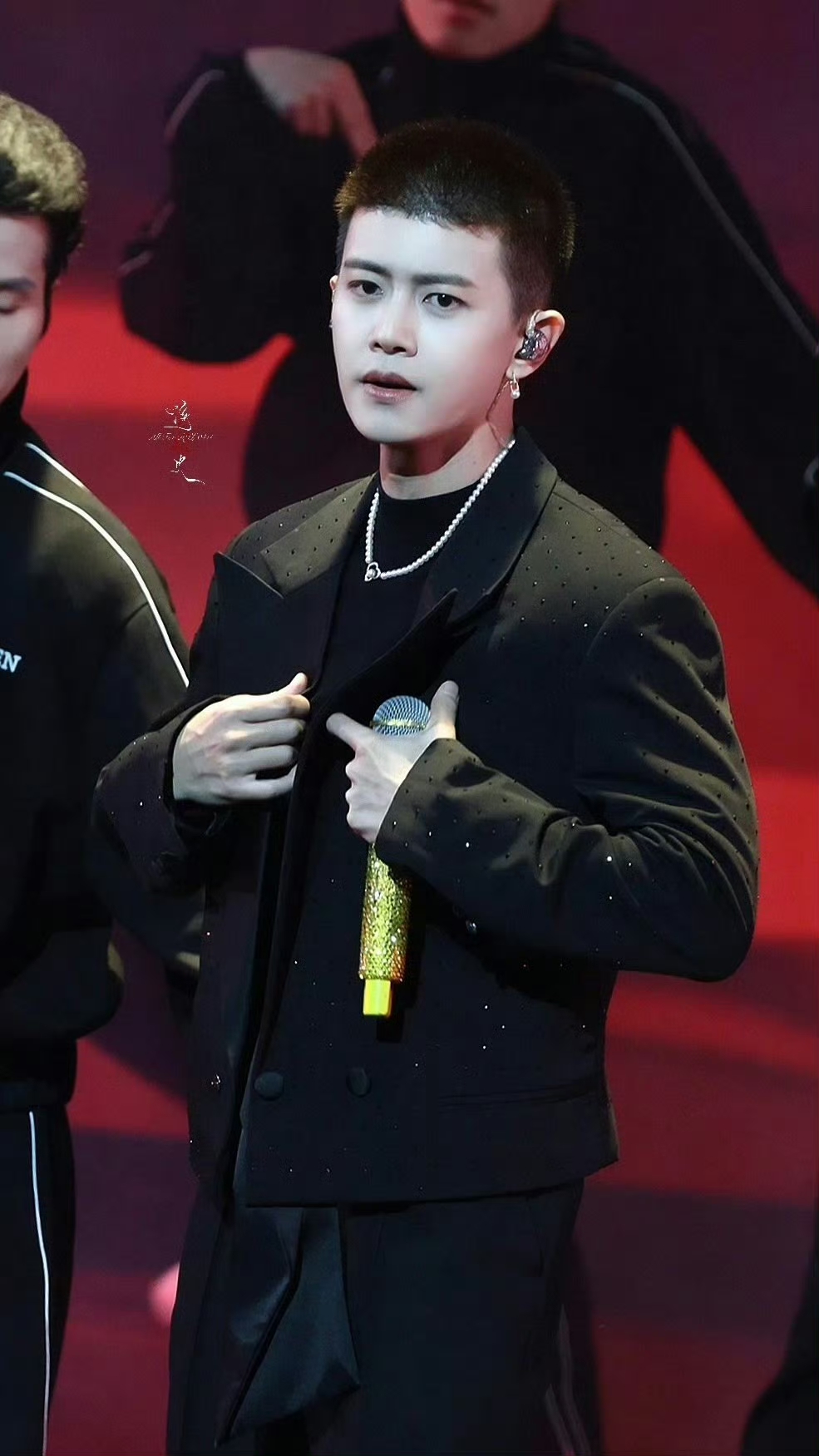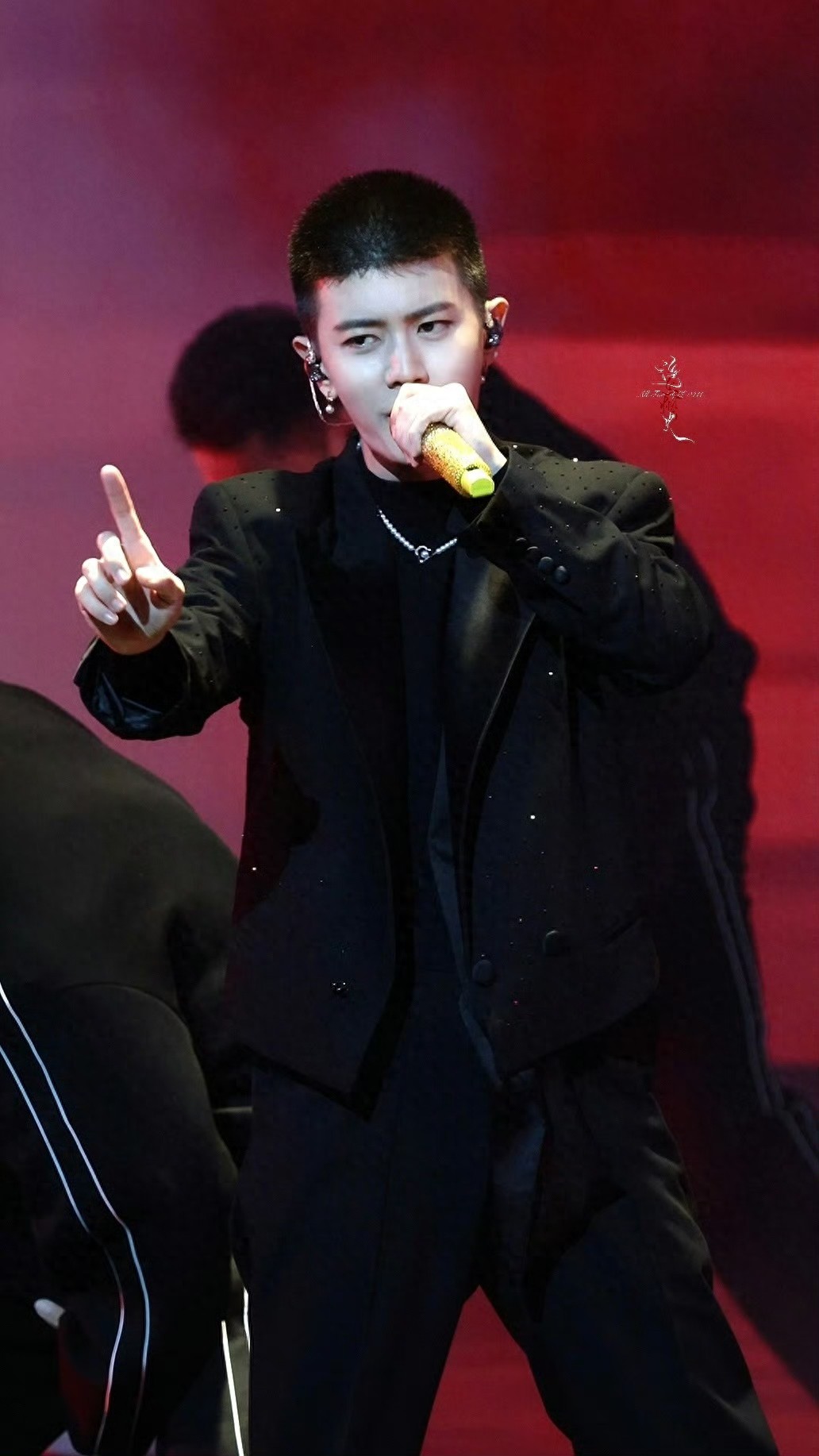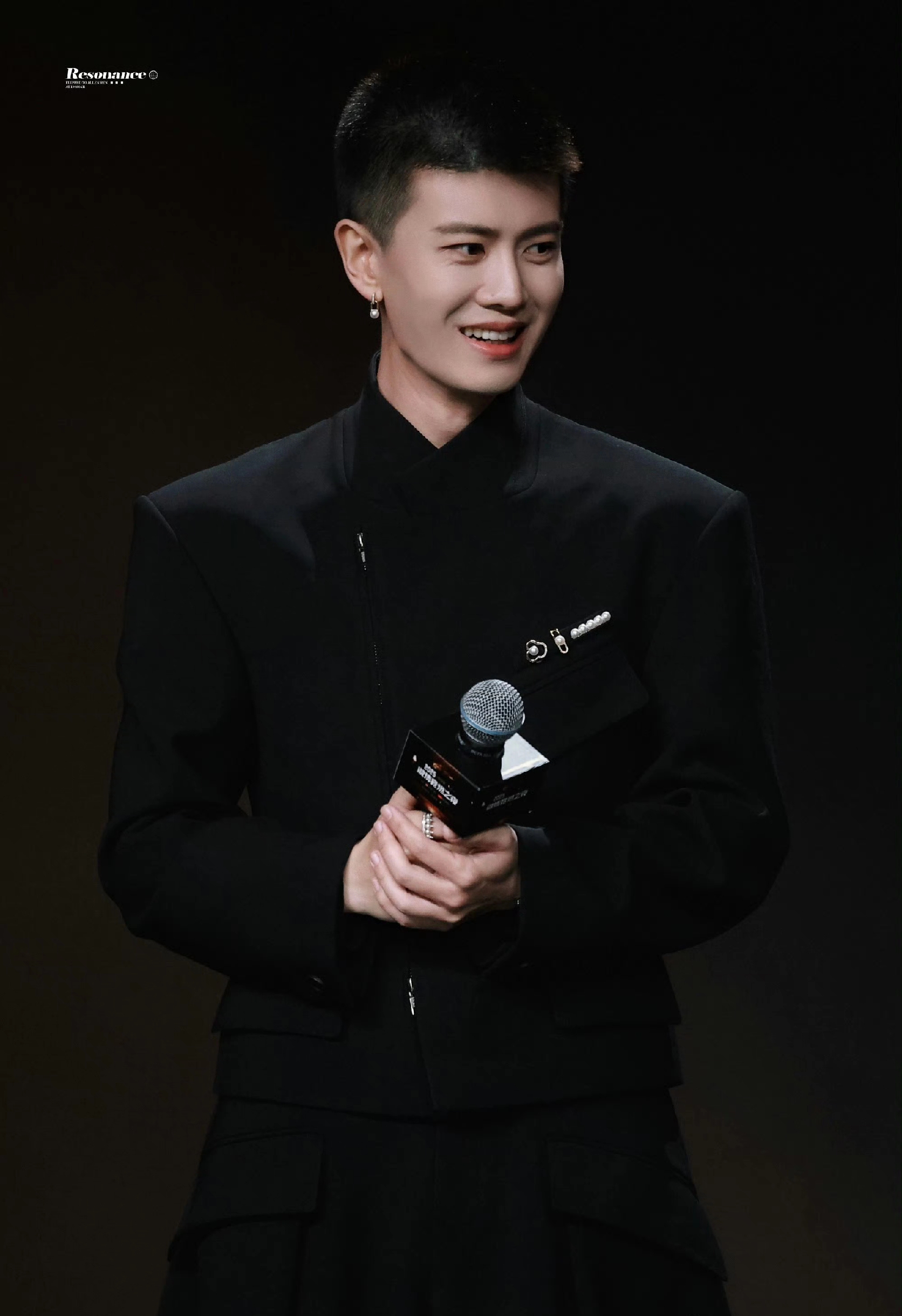 舞台上的任嘉伦,穿着带有闪钻的黑西装,搭配珍珠项链和耳饰,手持专属金色麦克风,在灯光效果加持下,造型帅气且充满舞台张力,尽显其唱跳实力与时尚表现力。