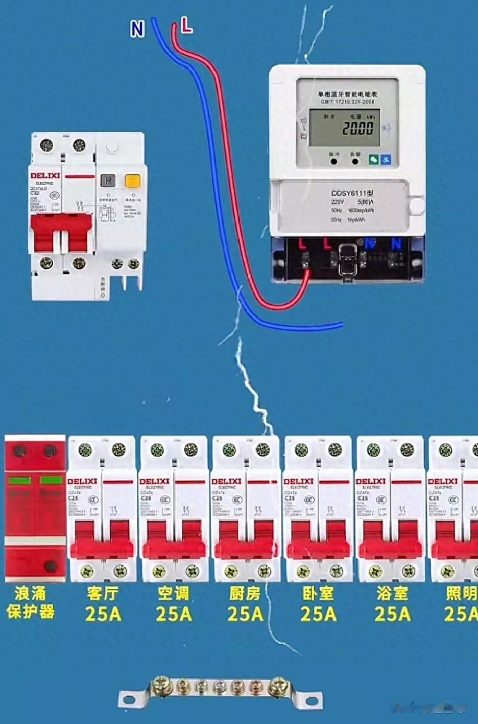 安装位置:总开关下方或分路开关上方,与主回路并联。