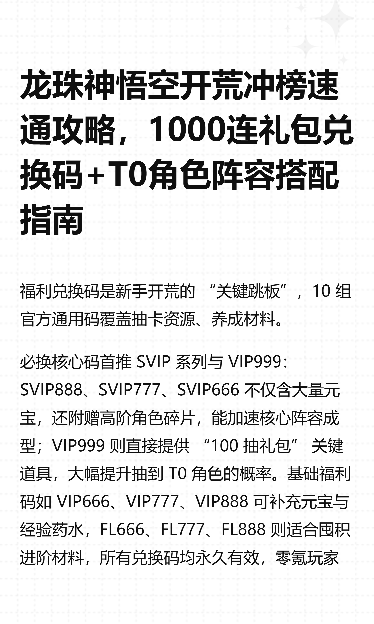 龙珠神悟空的核心乐趣在于收集强力角色、搭建巅峰阵容。新手玩家若想快速起步,需先抓牢官方福利,再明确角色强度与阵容搭配逻辑。这份攻略整合了 2026 年最新兑换码、T0 角色排行与最强阵容推荐,助你轻松解锁 “宇宙最强” 之路。