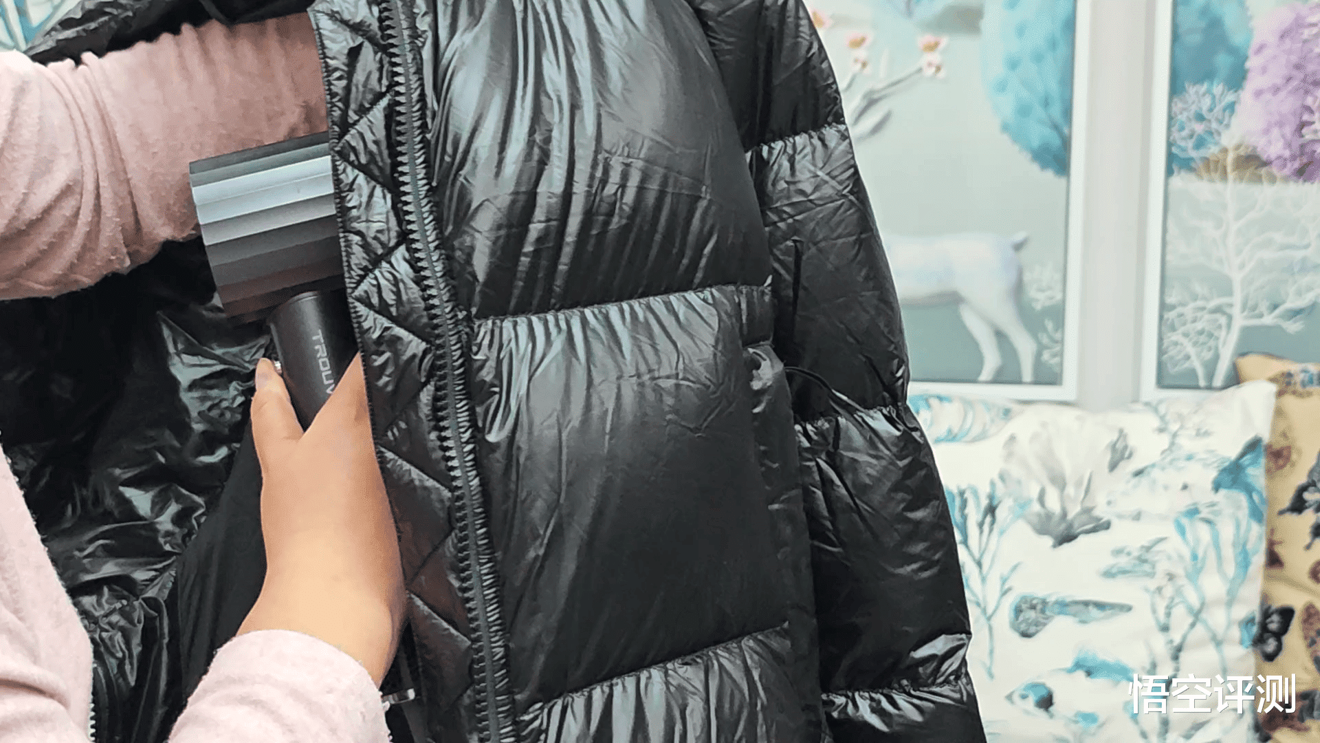 我们使用高速吹风机对着羽绒服内部吹,然后外部放一张纸巾。