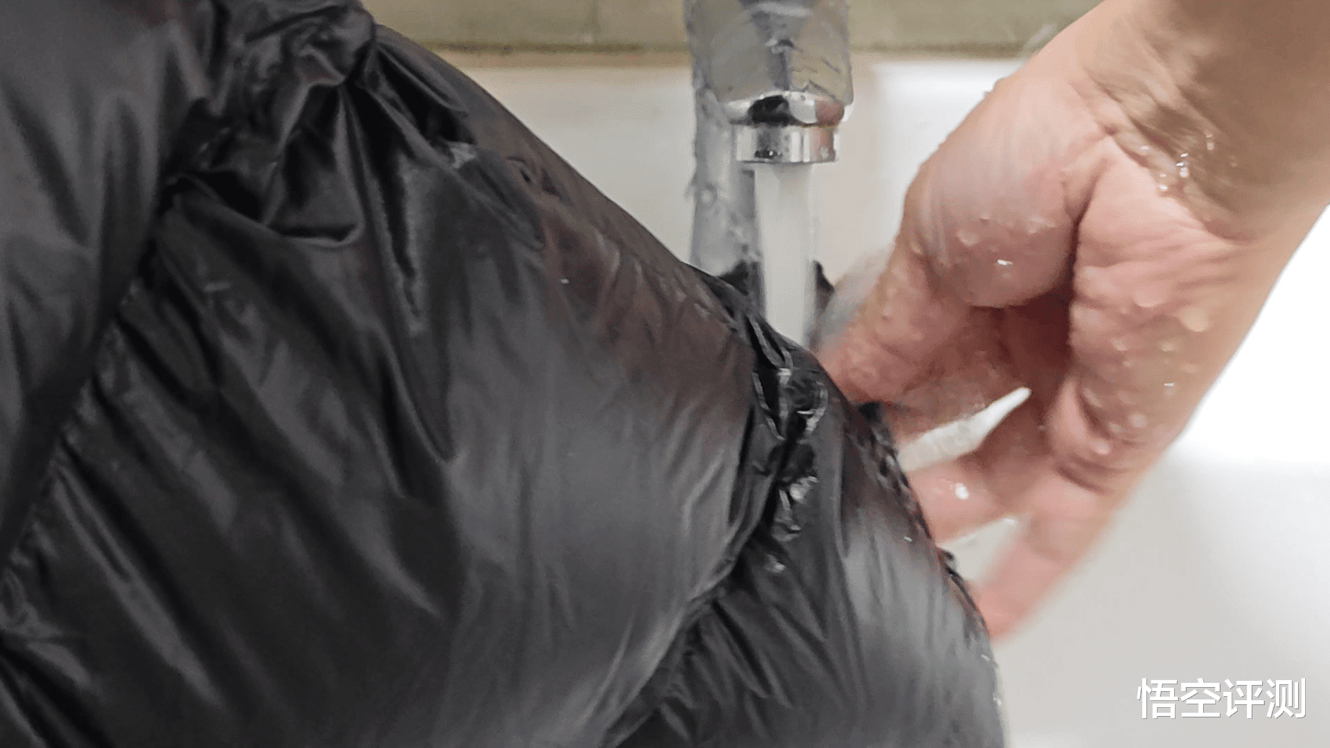 为了测试这种情况下,GK羽绒服的应对能力,特意将GK羽绒服的袖口放在水龙头下方进行冲洗。