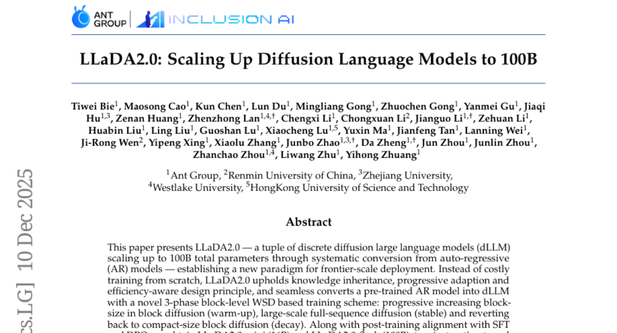 这项由蚂蚁集团联合人民大学、浙江大学、西湖大学和香港科技大学的国际研究团队于2025年12月发表在arXiv预印本平台上的研究(论文编号:2512.15745v1),成功开发出了名为LLaDA2.0的全新AI语言模型系列。这个系列的"旗舰"版本LLaDA2.0-flash拥有惊人的1000亿参数规模,在AI语言生成领域开创了一个全新的技术路径。