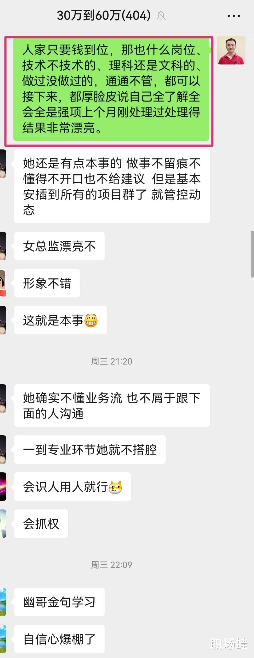 总监面试时1)说自己什么技术都懂,2)是文理复合型人才,3)问啥都说做过、接触过,入职后4)做事不留痕迹和把柄,5)不懂的就不开口不搭腔也不给建议,6)安排自己的人进入了各个项目群,7)在每个相关部门都安插了自己的眼线,8)侧重管理动态,9)打扮漂亮,树立形象,10)虽然不太懂业务流程但是不跟下面的人沟通太多,11)懂得识人用人,12)会抓权,其实还有13)会做PPT,14)常自费参加行业协会、俱乐部、混证书和头衔给自己贴金,15)营造家庭和谐、婚姻美满、财务自由但愿意为了工作不远千里、破釜沉舟的人设。