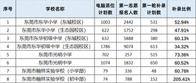从东莞市教育局官方网站获悉,近日,东莞教育局公布了市直属义务教育阶段民办学校第一轮补录计划。补录缺额高达3187人,其中,东莞市东华小学补录829人,东莞市东华初级中学补录993人,东华学校总共补录1822人。东莞光明小学补录515人,东莞光明中学补录613人,翰林实验学校补录200人。