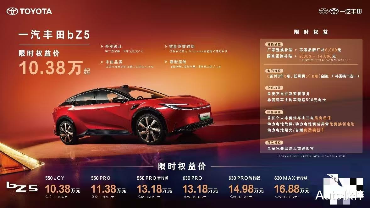 纯电车型bZ5在4月推出限时权益加码,置换权益升级为不限品牌厂补8000元,更可叠加9000-14600元的国家置换补贴,550JOY车型叠加厂补及国补后,限时权益价低至10.38万元。金融权益也是诚意满满,0首付3年0息,低月供5年0息,降低购车门槛(置换、金融二选一)。同时匹配免费充电桩、500元电卡、非营运车主三电终身质保及电池三兜底保障政策,为后续用车提供安心保障。4月购车用户还可免费获赠天窗遮阳帘,舒适加倍。