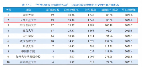 日前,中国工程院发布《2025全球工程前沿》报告。天津工业大学成功入选“个性化医疗用智能纺织品”工程研究前沿核心论文主要产出机构榜单,并列全球第一,彰显了学校在智能纺织与医工交叉融合领域的强劲科研实力和国际影响力。