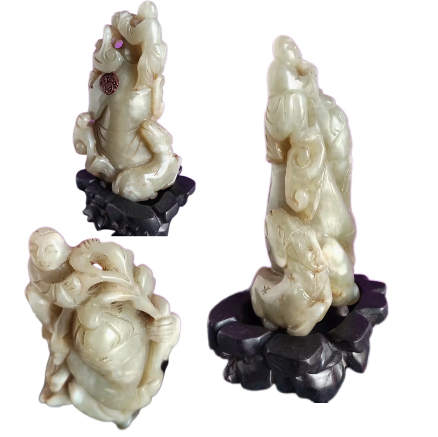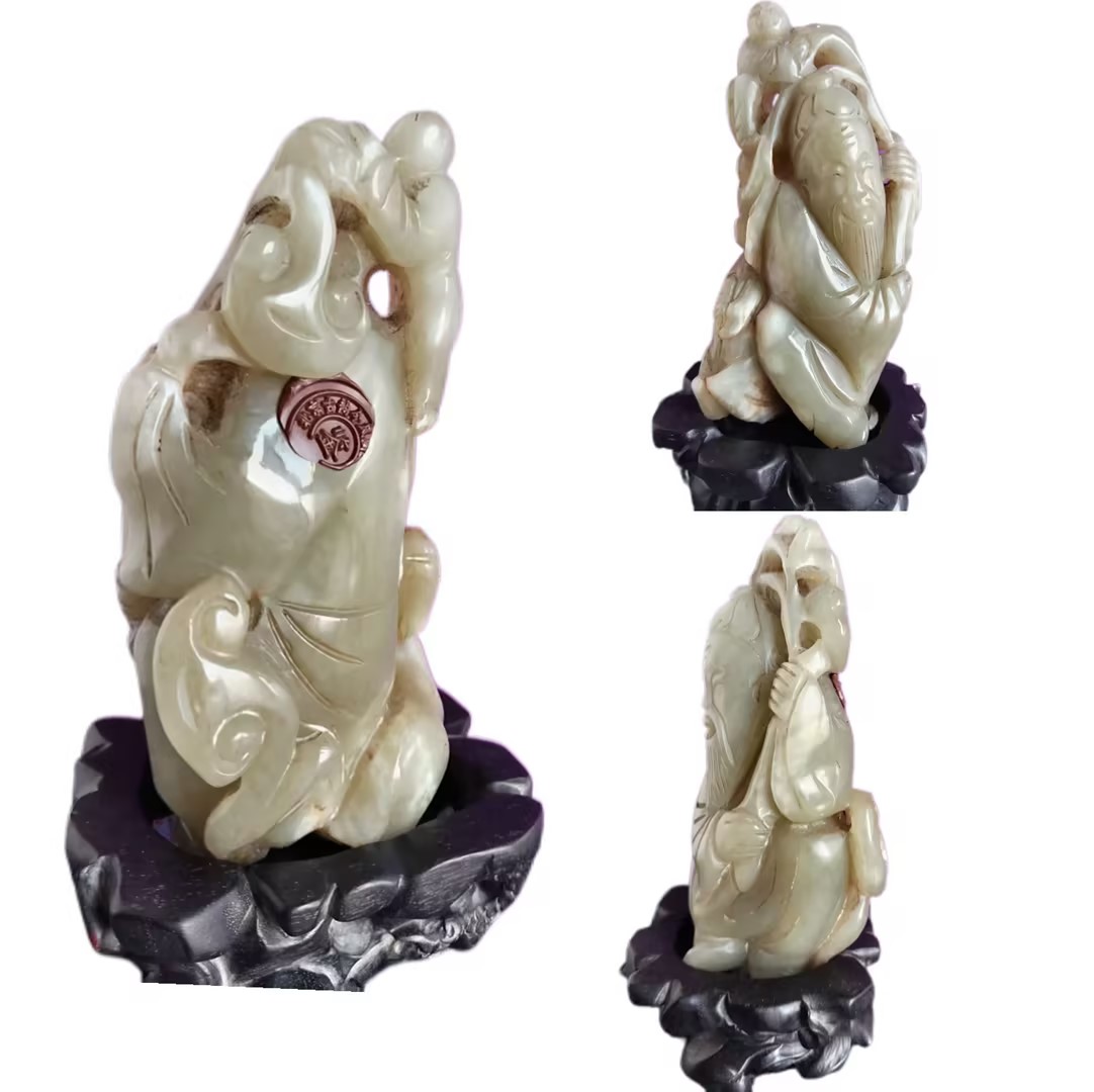 这件摆件的玉料源自新疆和田,玉质细腻温润,油脂感十足,局部带天然沁色,是和田玉 “精光内蕴” 特质的典型体现。清中期的和田玉料开采艰难、运输不易,仅宫廷造办处能批量使用顶级玉料。据《清会典》记载,乾隆时期每年从和田进贡的玉料中,仅不足 10% 能达到此类摆件的玉质等级,其稀缺性可见一斑。