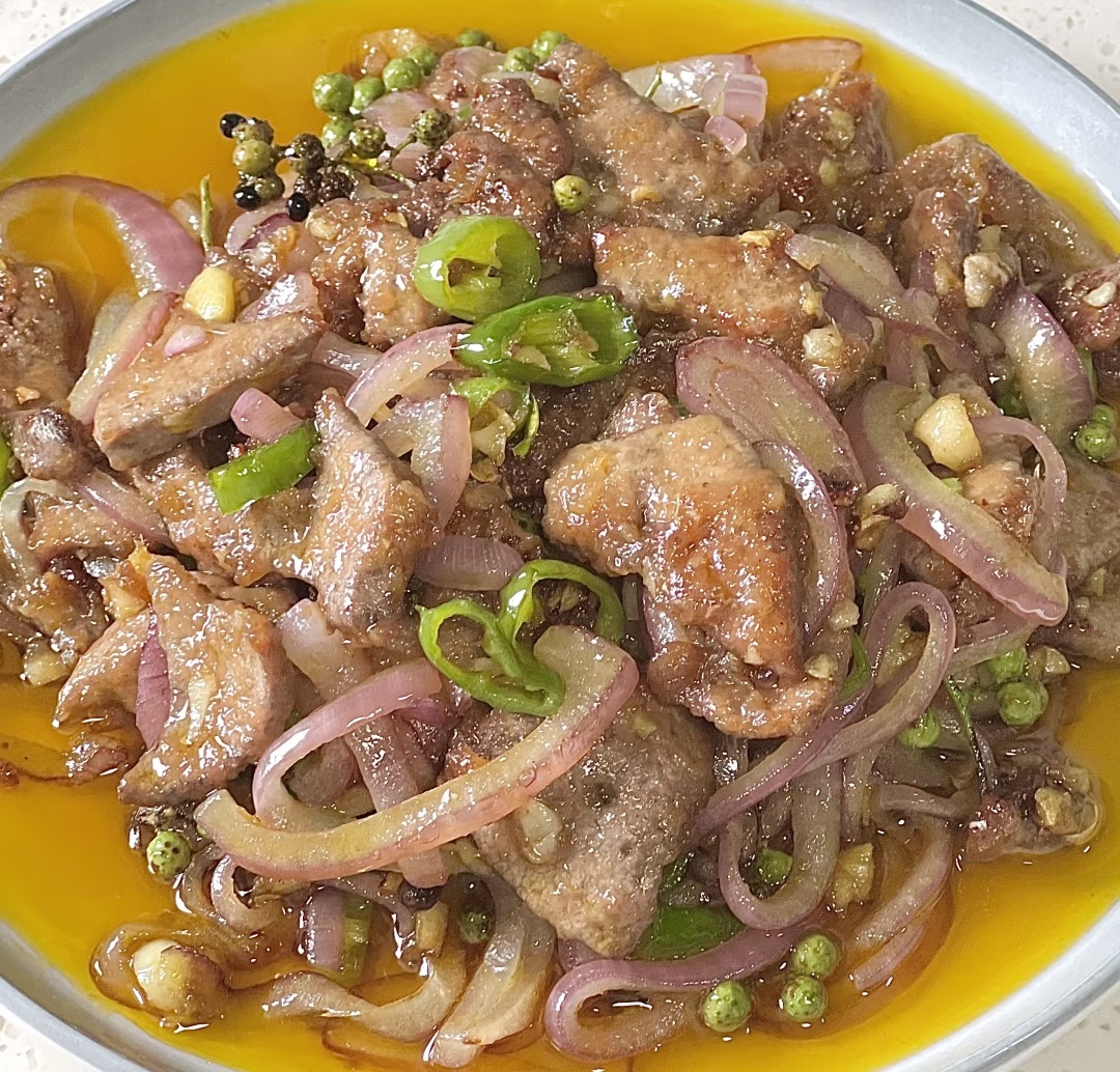 趁热把洋葱炒猪肝盖在热米饭上,酱汁顺着米粒往下渗,挖一大勺,猪肝嫩到弹牙、洋葱甜到爆汁,嘴里像放了一场小型烟花。最后别忘刮锅底——那层“锅巴”是精华,外婆叫它“幸福痂”,抢到手的人下周洗碗全包!