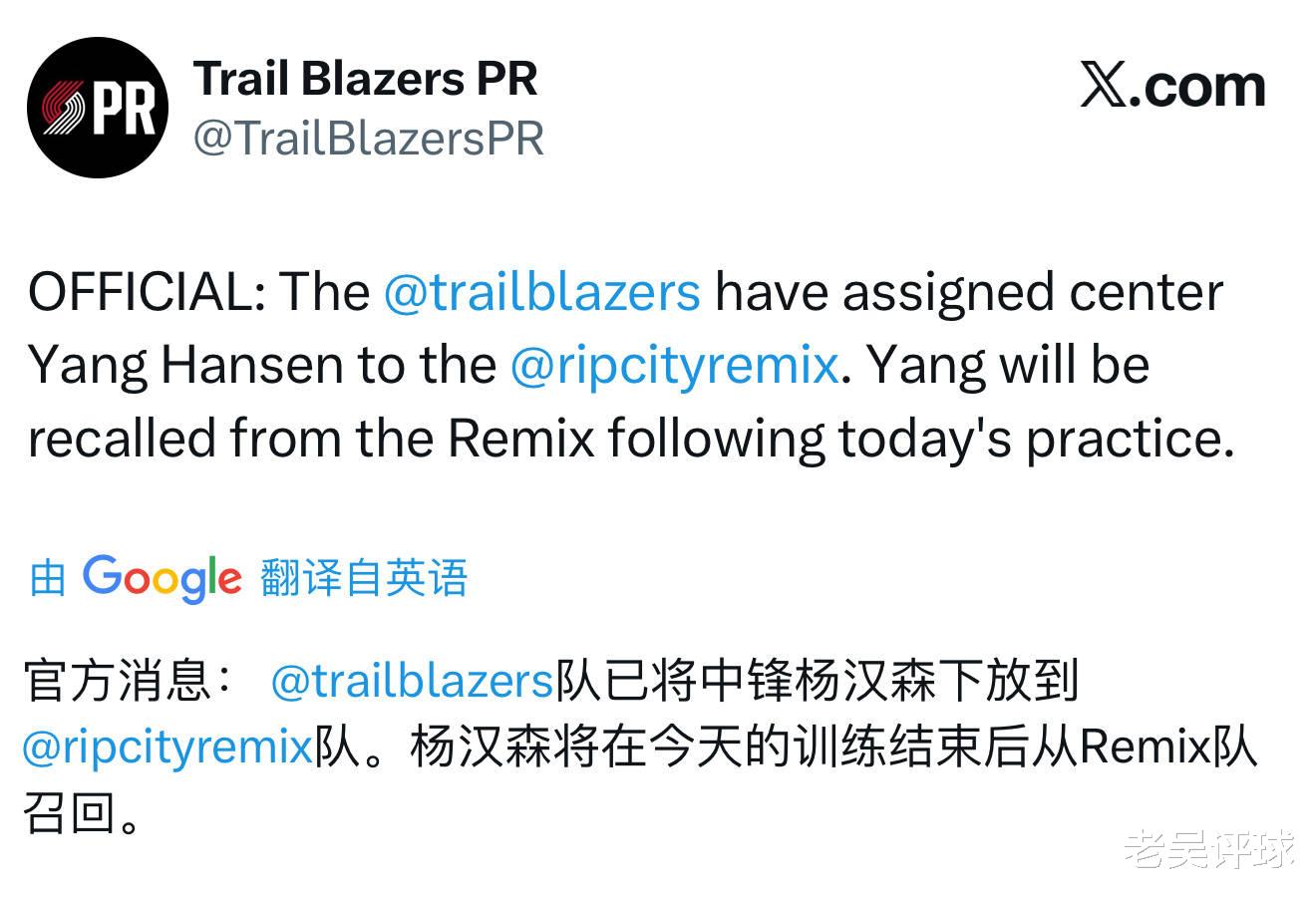 11月5日,开拓者官方消息,杨瀚森下放到发展联盟撕裂之城混音队再次训练,训练结束后,杨瀚森将从混音队被召回。