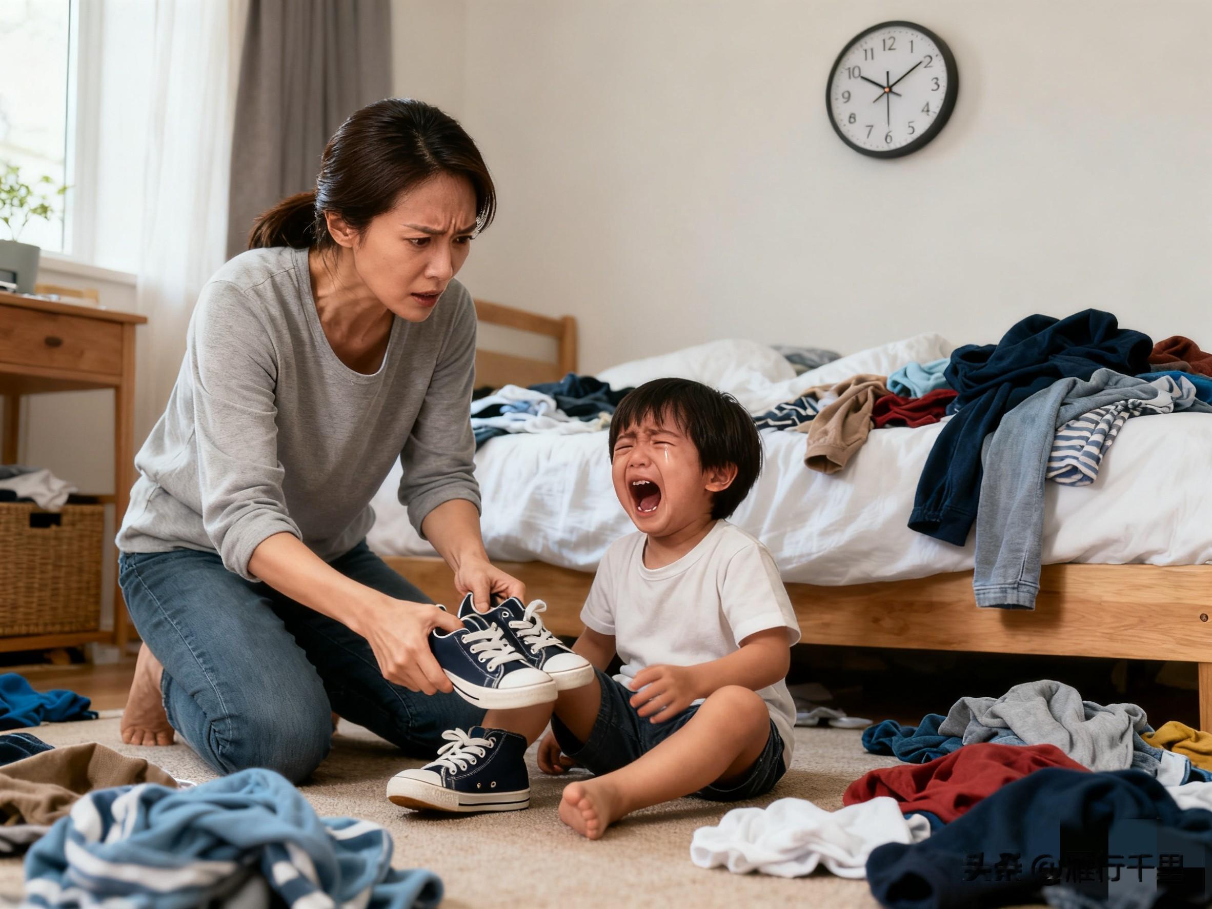 最后她夺过鞋子强行给孩子穿上,孩子哇哇大哭,她满腹委屈:“我这么着急,他怎么就这么磨蹭?”