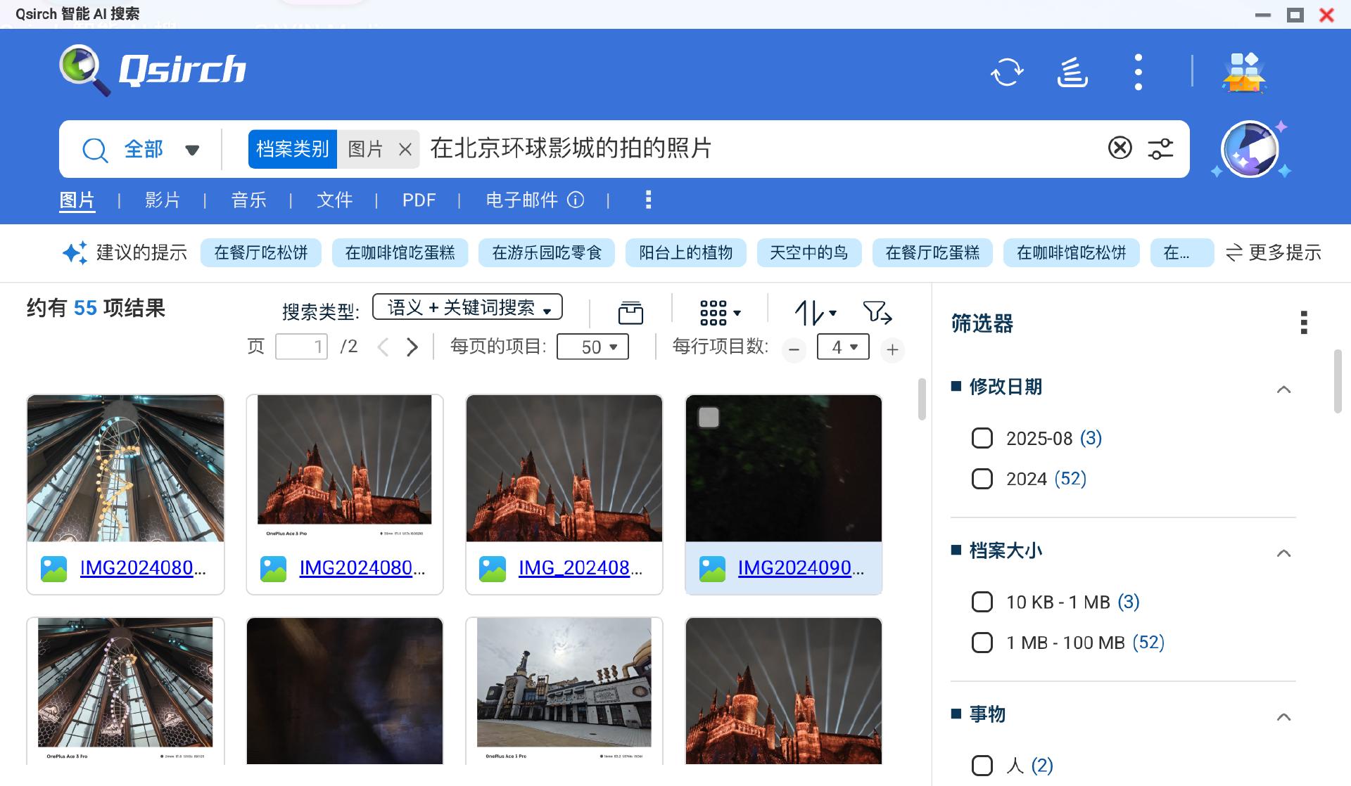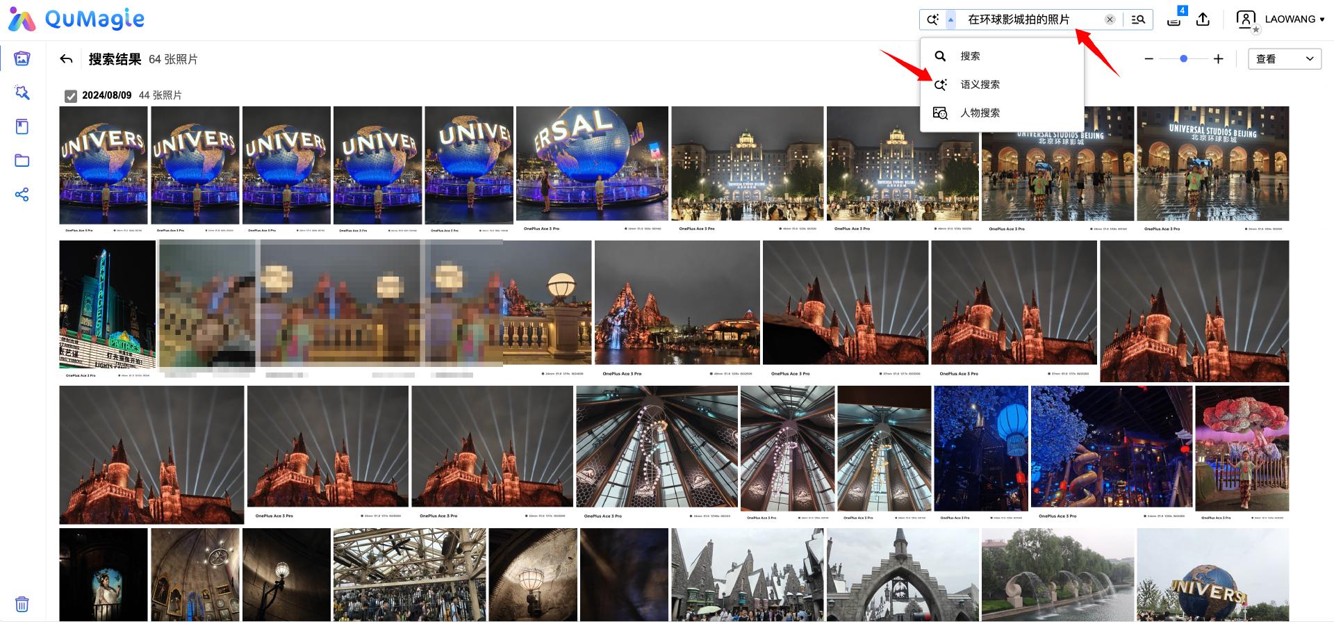 例如,我需要找一些去年去北京环球影城玩时拍的照片,先把搜索模式切换至“语义搜索”,然后在输入框中输入“在环球影城拍的图片”,只需要不到3秒的时间,QuMagie就能在几千张照片中准确的找出几十张环球影城的照片。