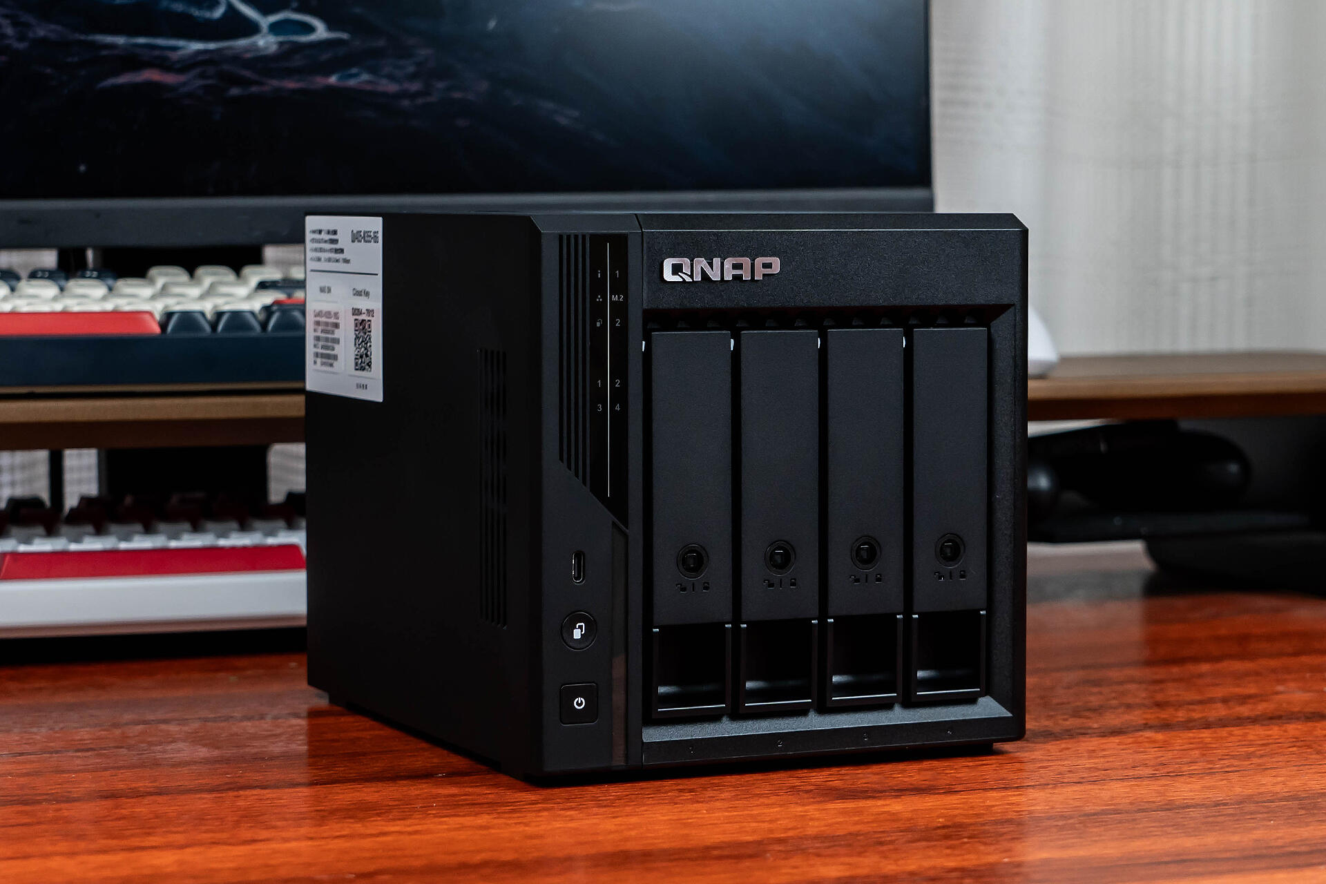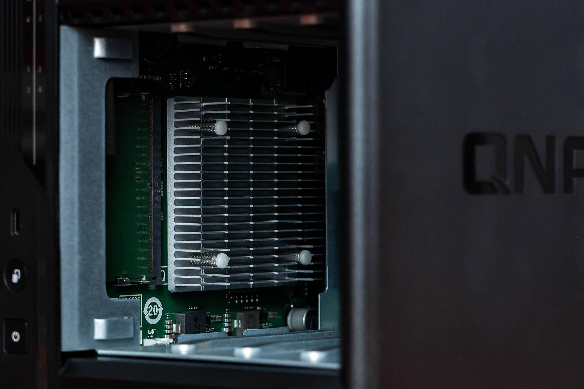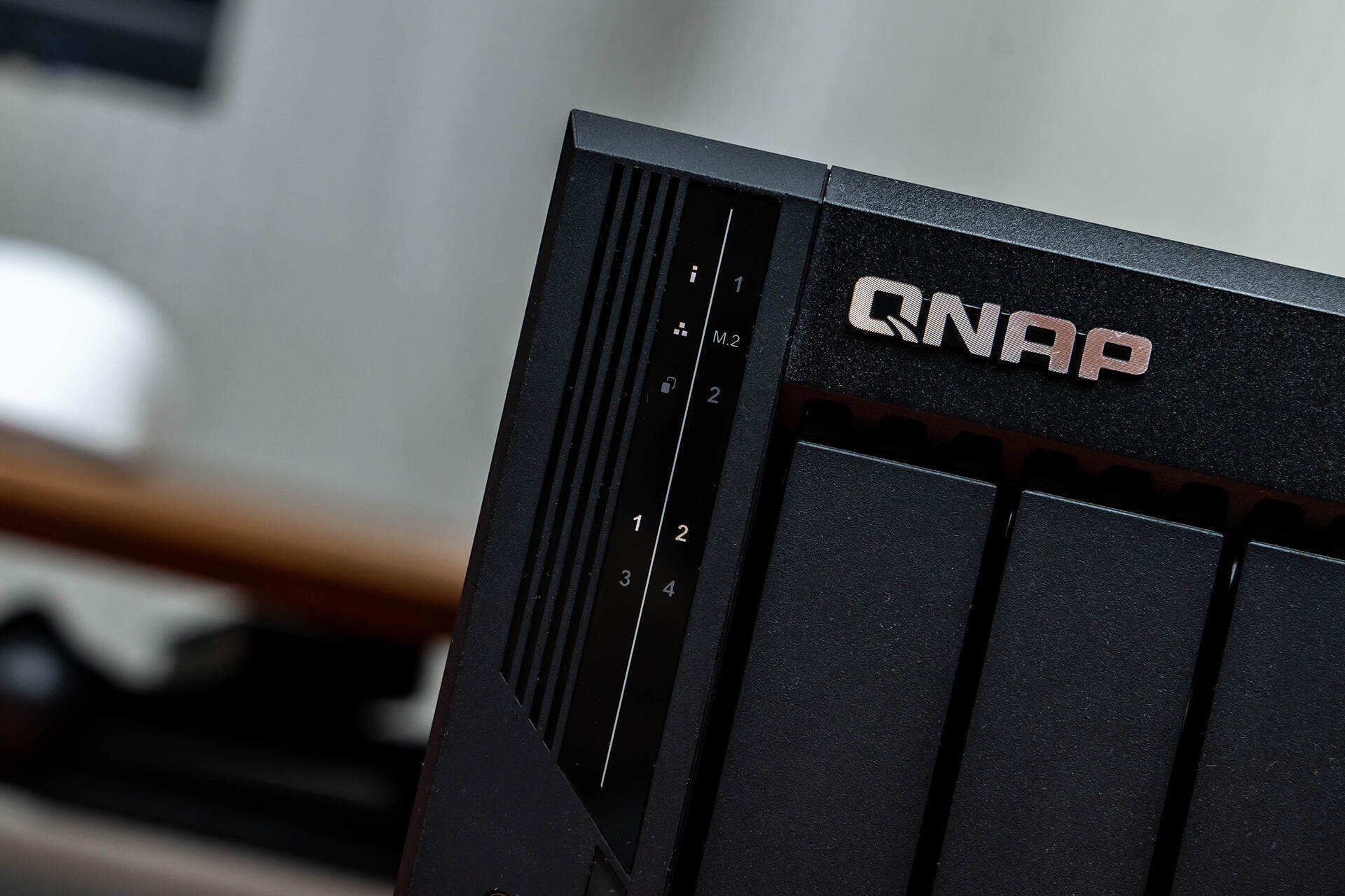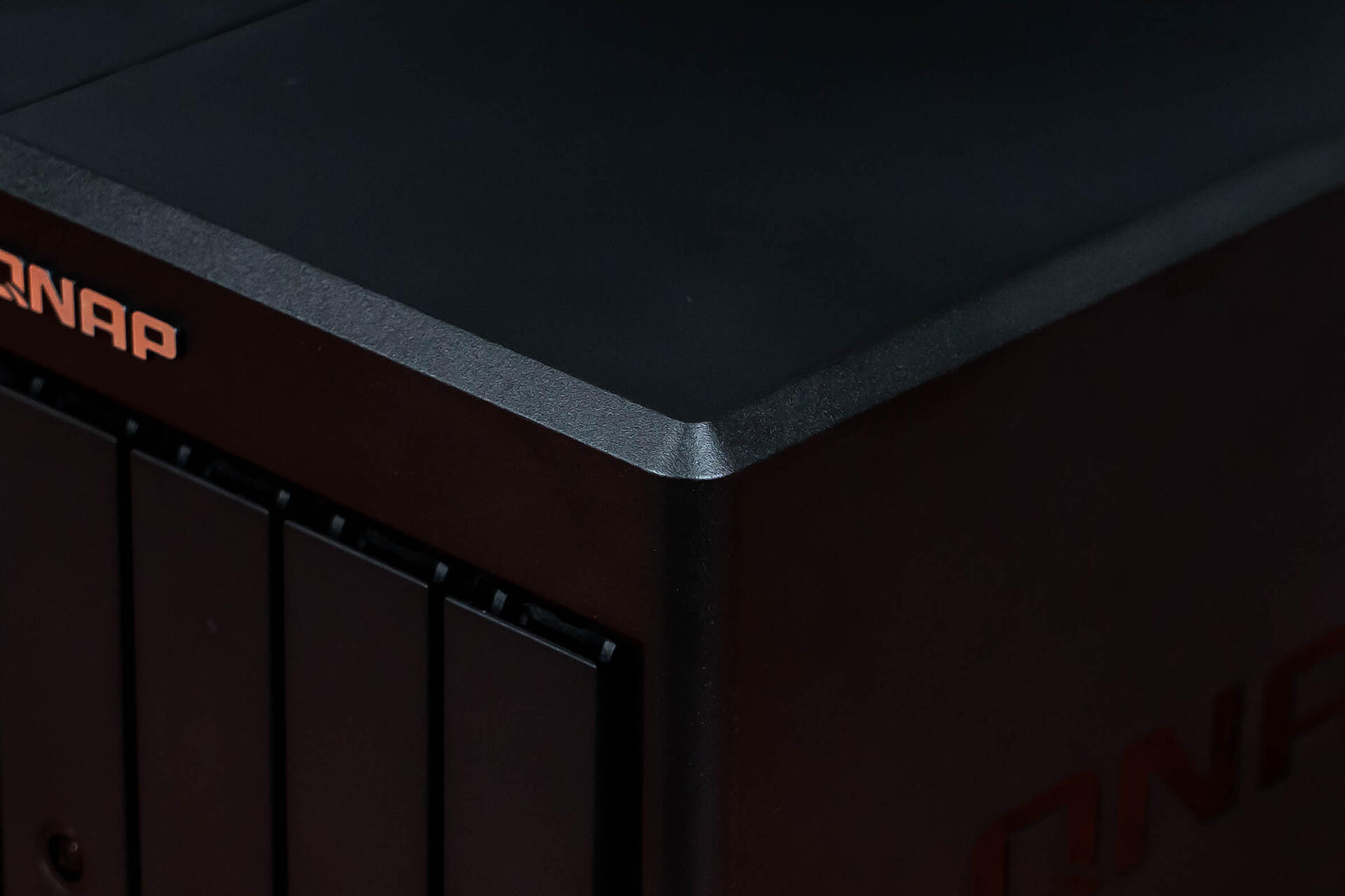 机身侧面设计了“QNAP”字样的暗刻LOGO,看着比之前单调的纯黑色侧面顺眼了许多。