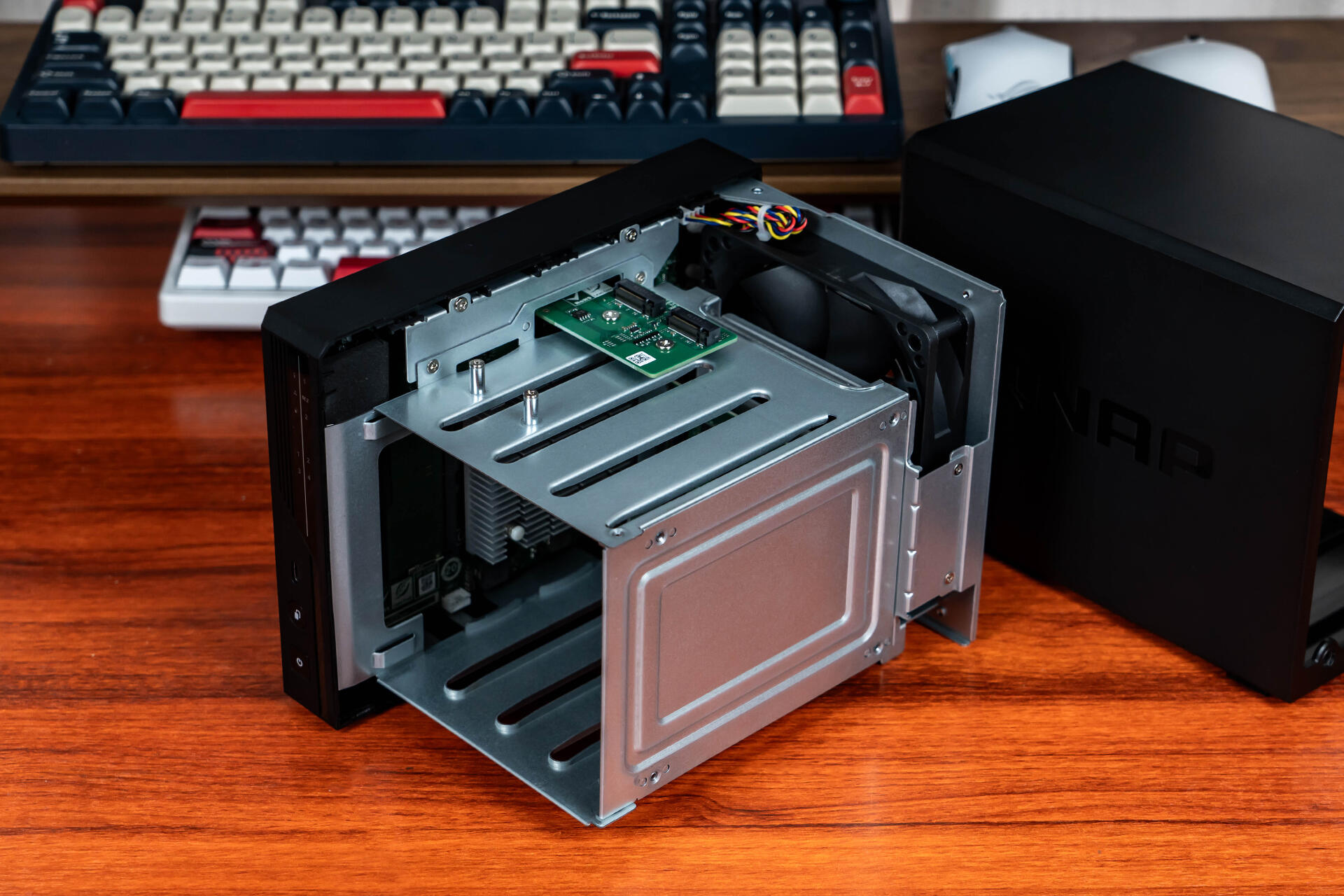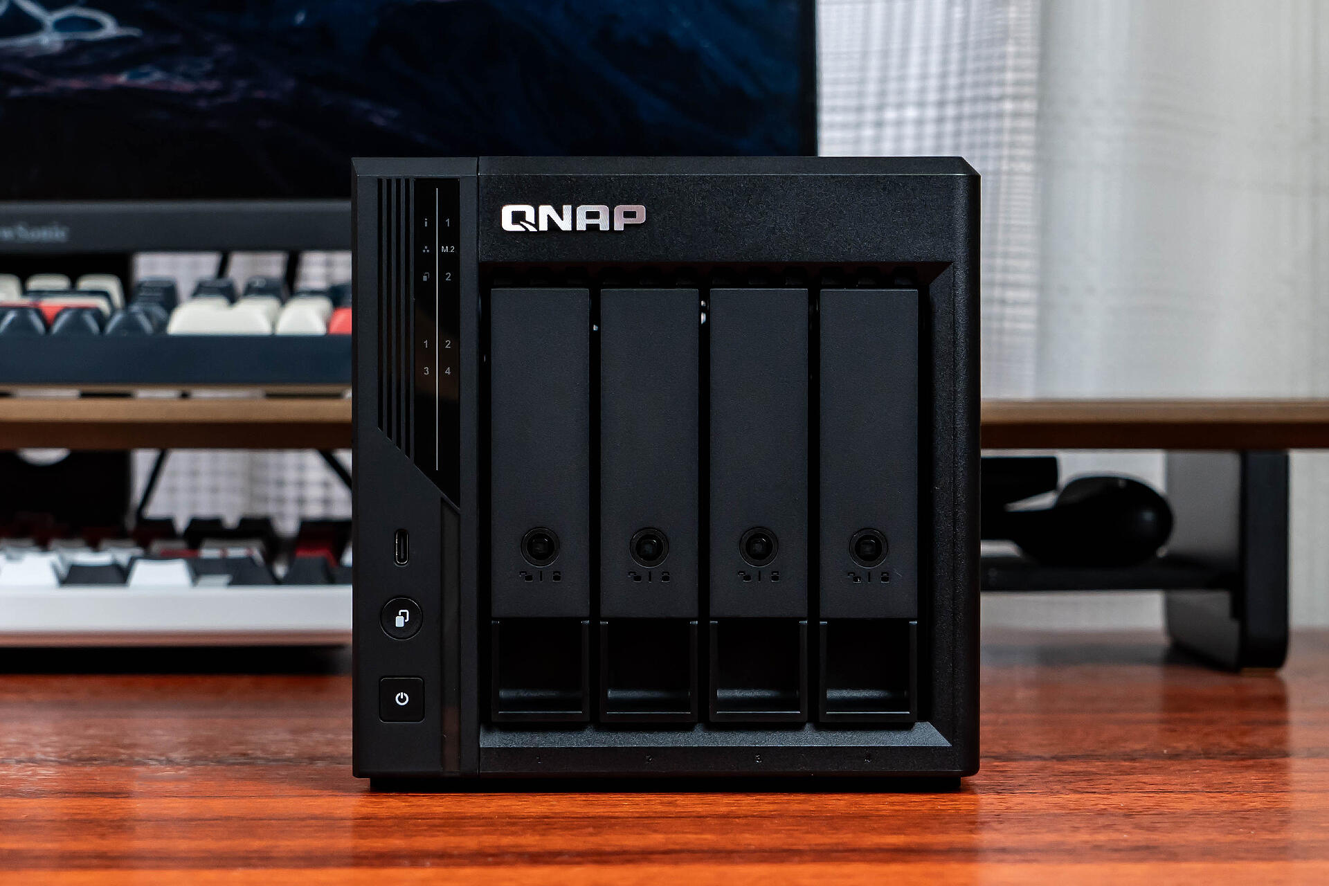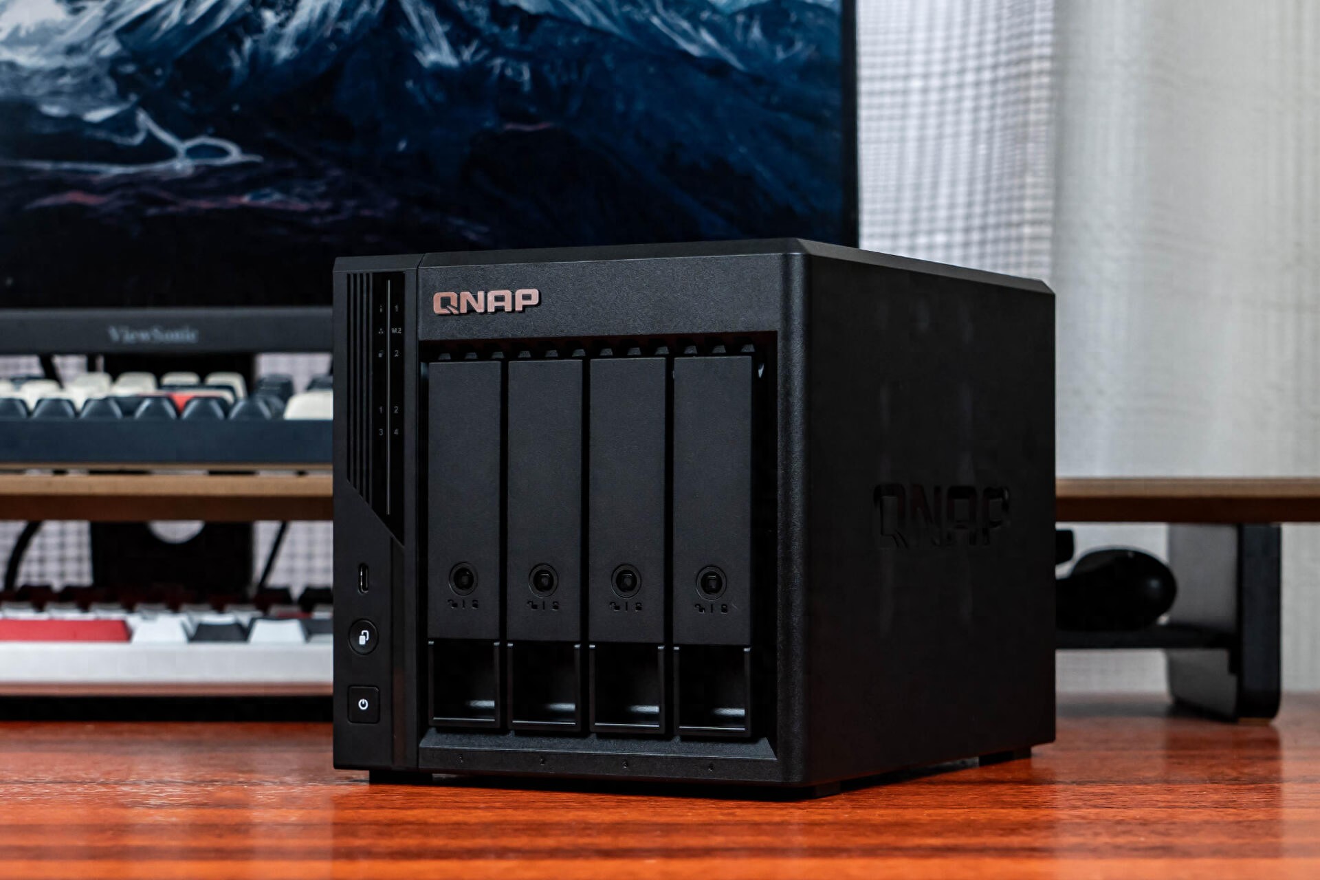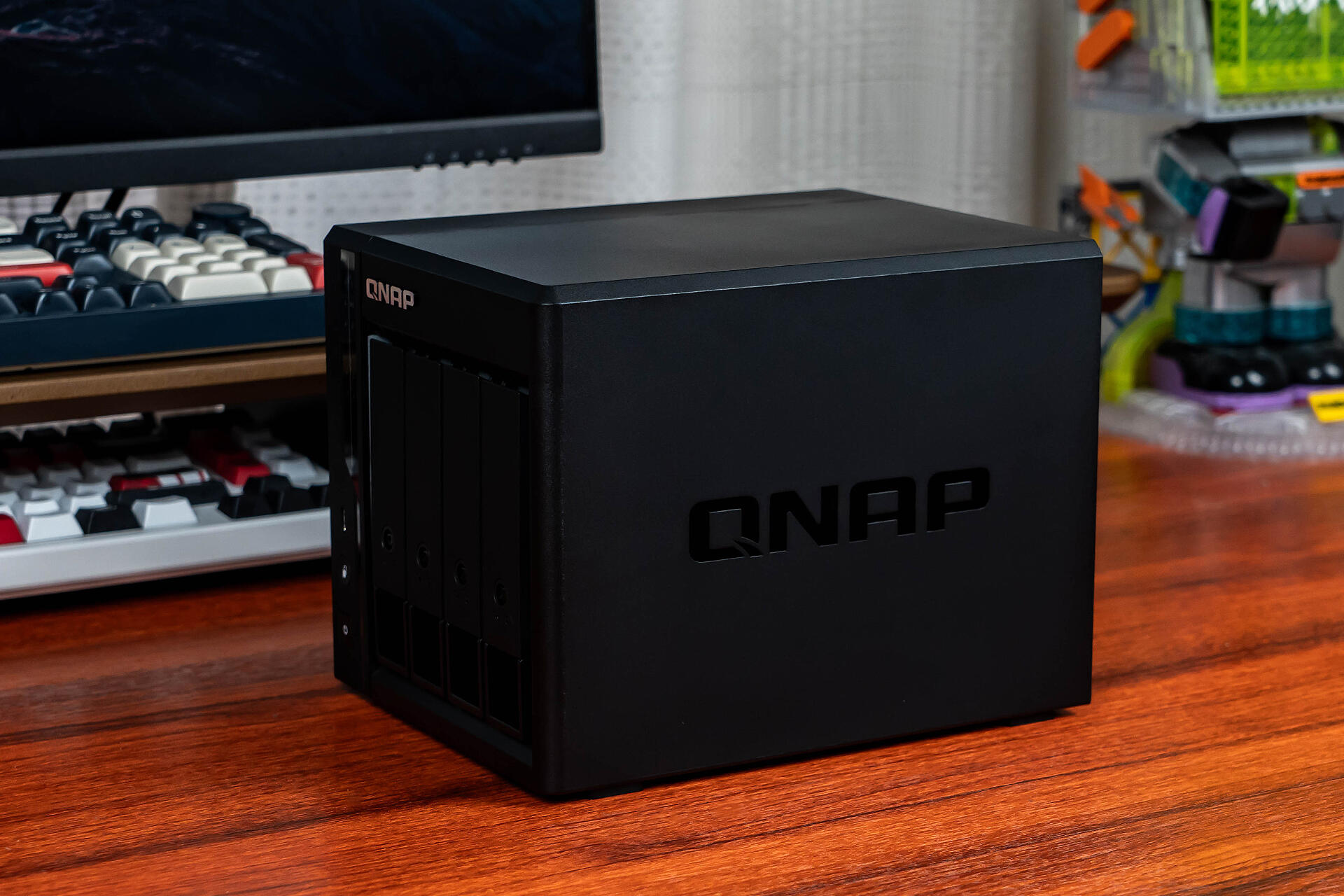 机身侧面设计了“QNAP”字样的暗刻LOGO,看着比之前单调的纯黑色侧面顺眼了许多。