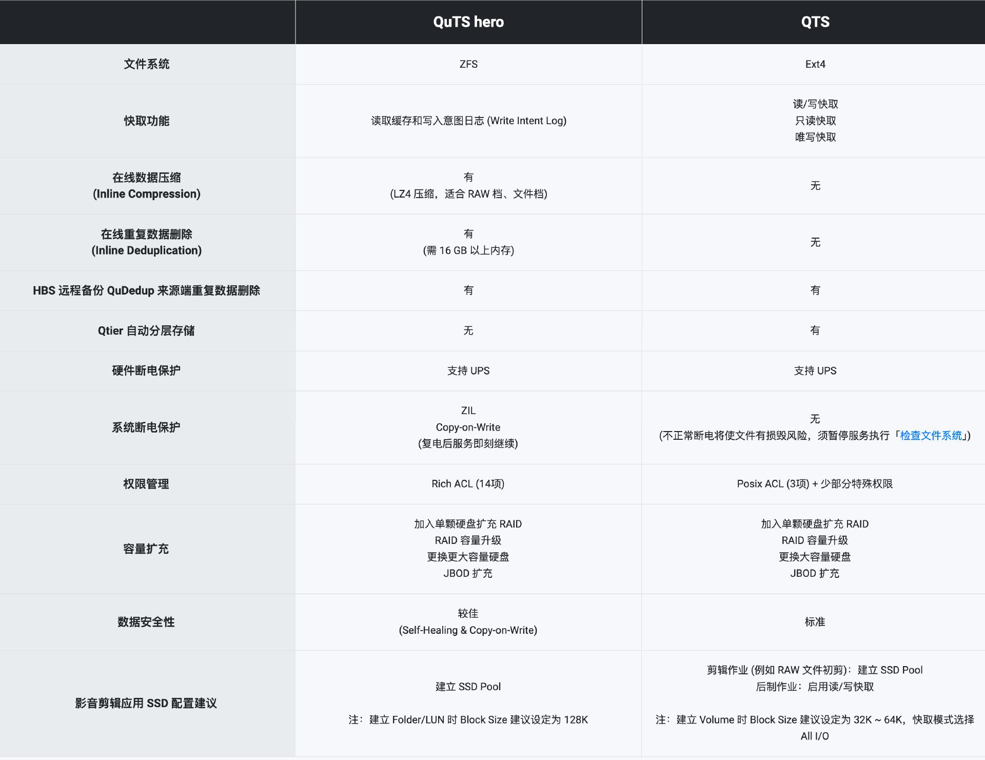 QuTS hero与QTS系统最大的不同是采用了更全面的ZFS文件系统(QTS是Ext4),安全系数更高、稳定性更强,主要面向企业级用户以及需要大规模数据存储的应用场景。这里简单概括QuTS hero系统的重要功能与优势: