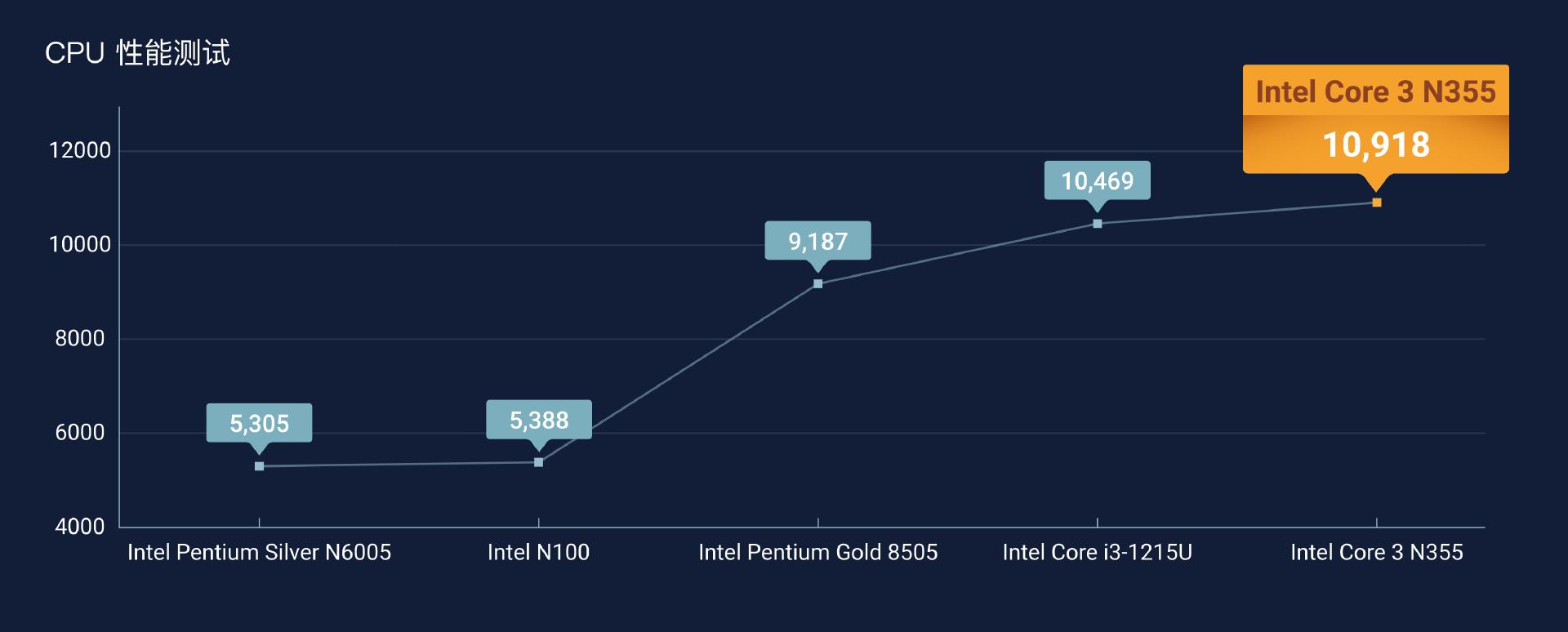 威联通Qu405搭载了新一代Intel酷睿N355处理器,拥有8核心8线程,最大睿频频率3.9 GHz,6MB高速缓存。性能表现如下图所示,N355处理器的综合性能大约是N6005、N100的2倍,比目前主流的高端NAS处理器intel Pentium Gold 8505提升了约19%,提升非常显著。