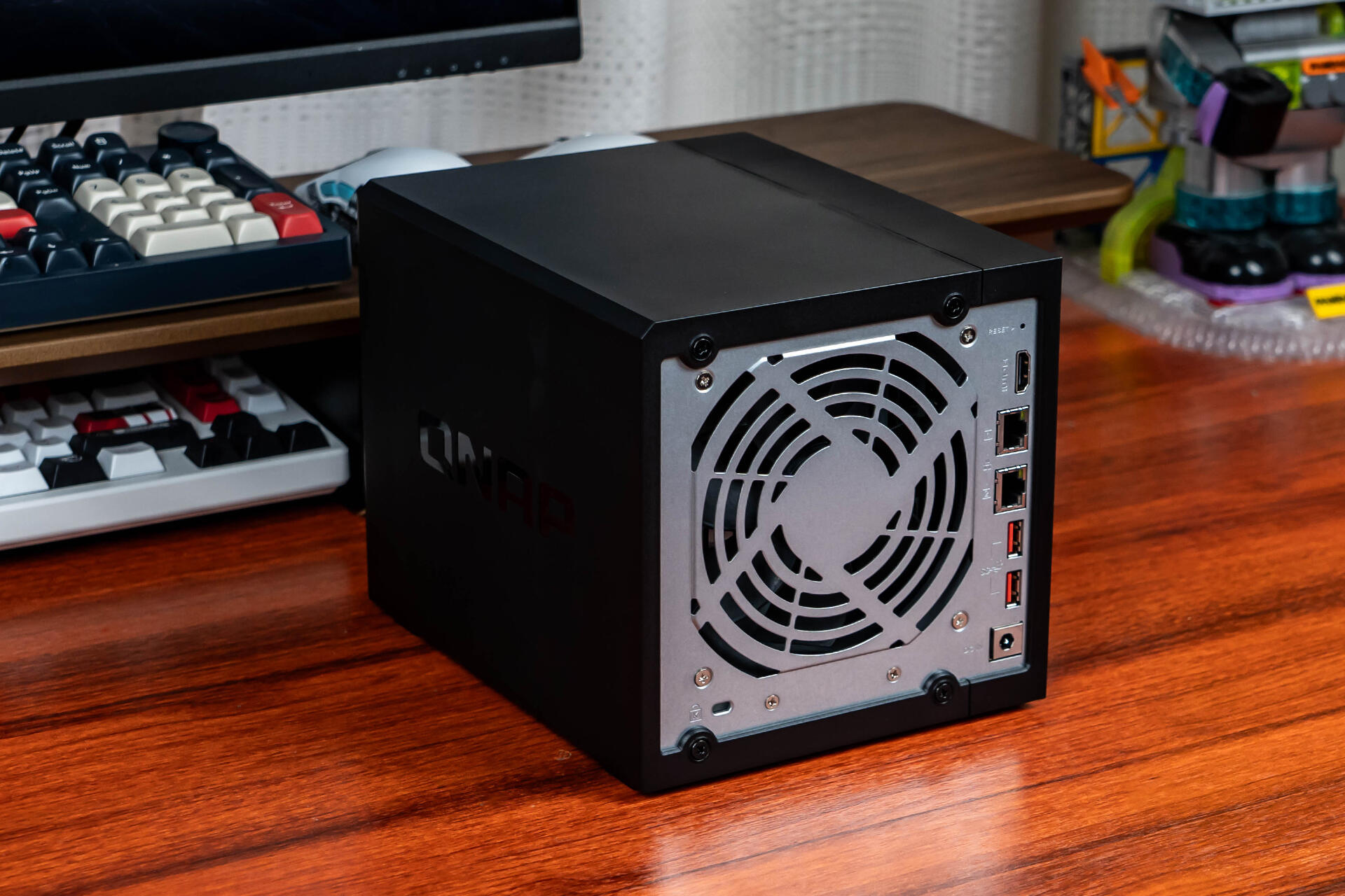 机器后面有一枚14cm风扇,是整机的散热保障。侧边有一排丰富的拓展接口以满足日常所需,从上至下依次为:密码重置按钮、HDMI 2.1视频接口(4K@60Hz)、双2.5GbE网口(支持链路聚合)、USB 3.2 Gen2(10Gbps)x2、电源接口。