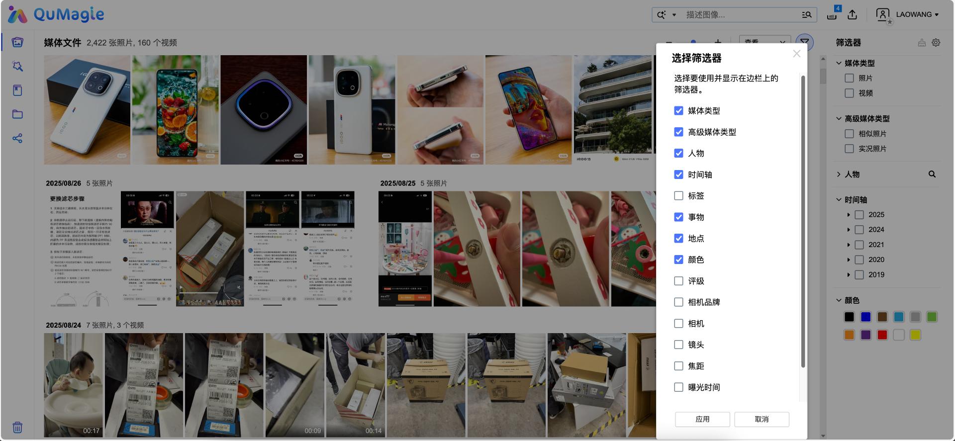 在页面右上角,QuMagie提供了多种类型的筛选器,我们也可以利用人物、日期、标签、事物、地点这些标签,甚至是拍摄参数信息迅速找到想找的照片。