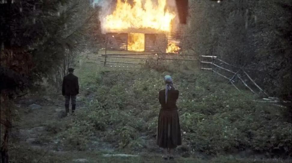 电影中燃烧的谷仓场景成为影史经典。在柔和的雨中,谷仓燃烧成灰烬,既象征了童年的消逝,也暗示了战争对平静生活的摧毁。