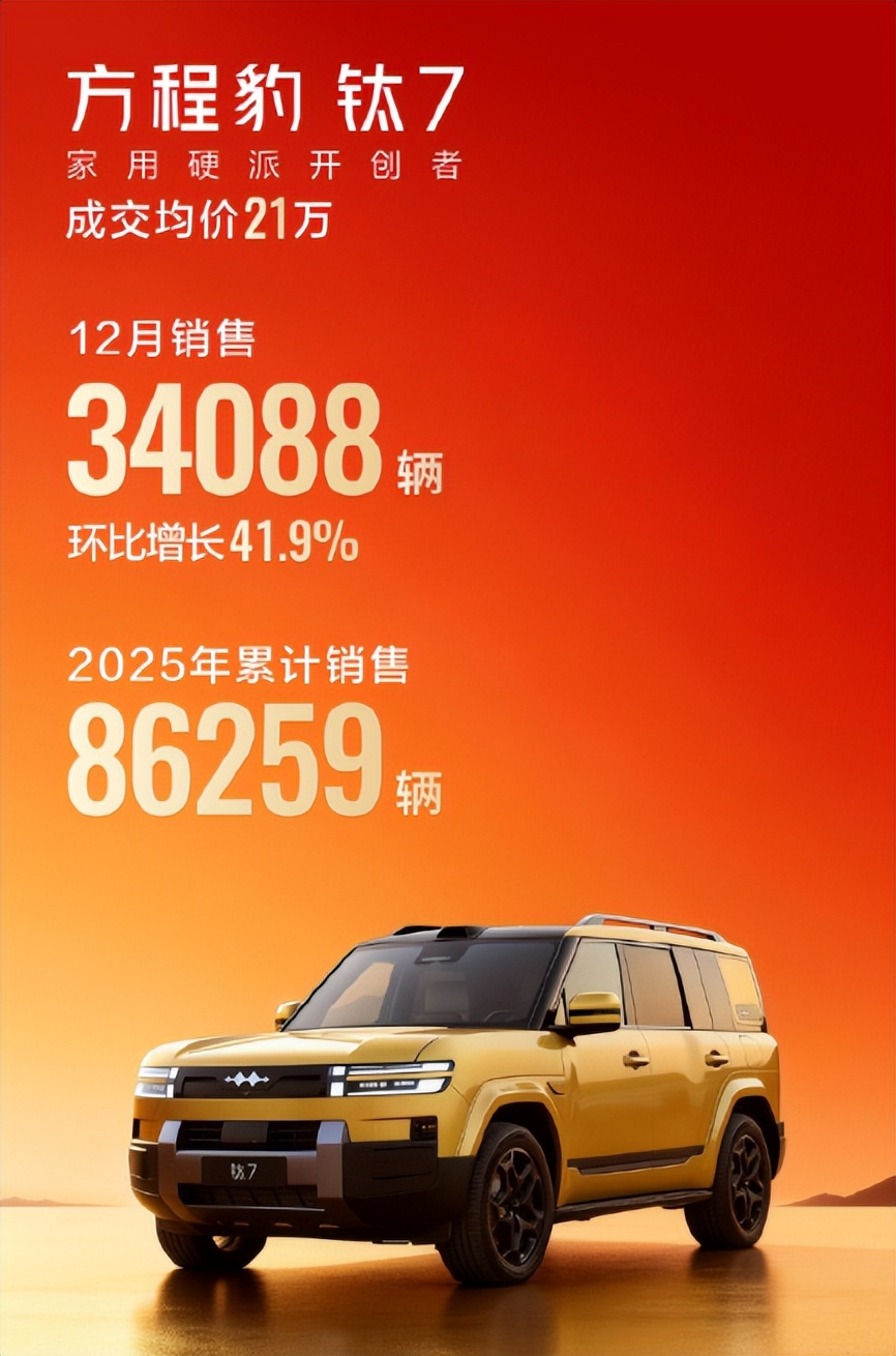 钛7(家用硬派):12月卖了34088辆、全年86259辆。以前硬派是“油老虎+不舒适”的代名词,家用用户不敢碰,但它把硬派造型和家用舒适、经济性完美融合——刚好戳中“想换SUV又想要点个性”的家庭,直接把硬派门槛降到了家用能接受的范围。