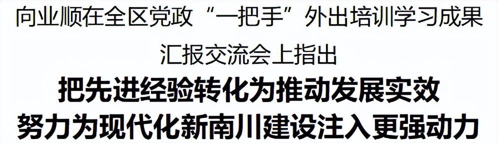 向业顺在讲话中指出,要深刻认识先进地区成功的关键要诀,全面总结启示,把准发展关键。要激发“思想破冰”,将受到的触动转化为推动南川发展的干劲,将可借鉴的理念、方法与南川区实际相结合,找到创新的突破口和行动的源动力,真正将“所学”转化为“所用”。
