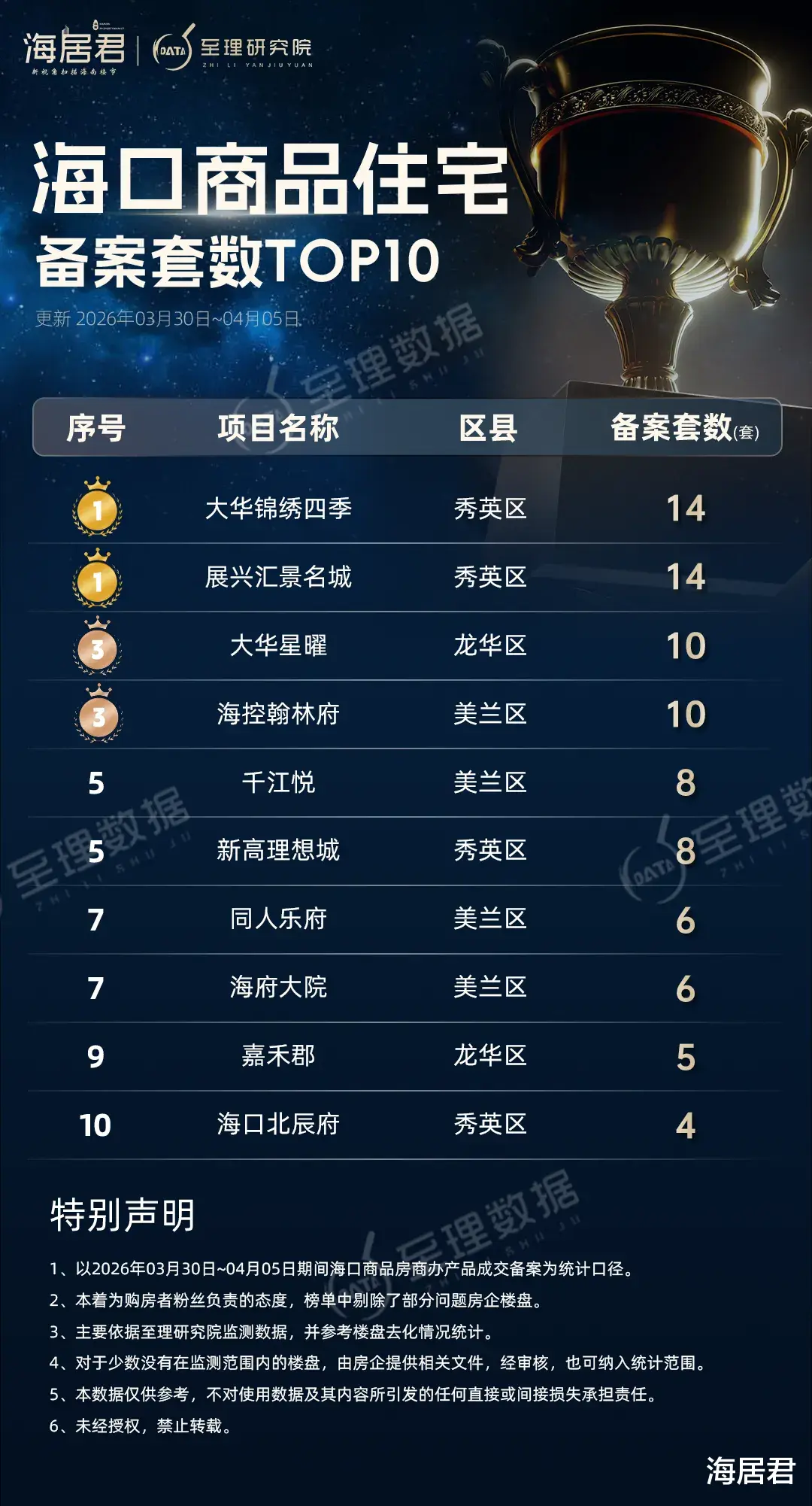大华锦绣四季、展兴汇景名城均成交14套,并列上周海口商品住宅成交套数第一;另外,前者摘得成交面积冠军,后者拿下成交面积亚军。