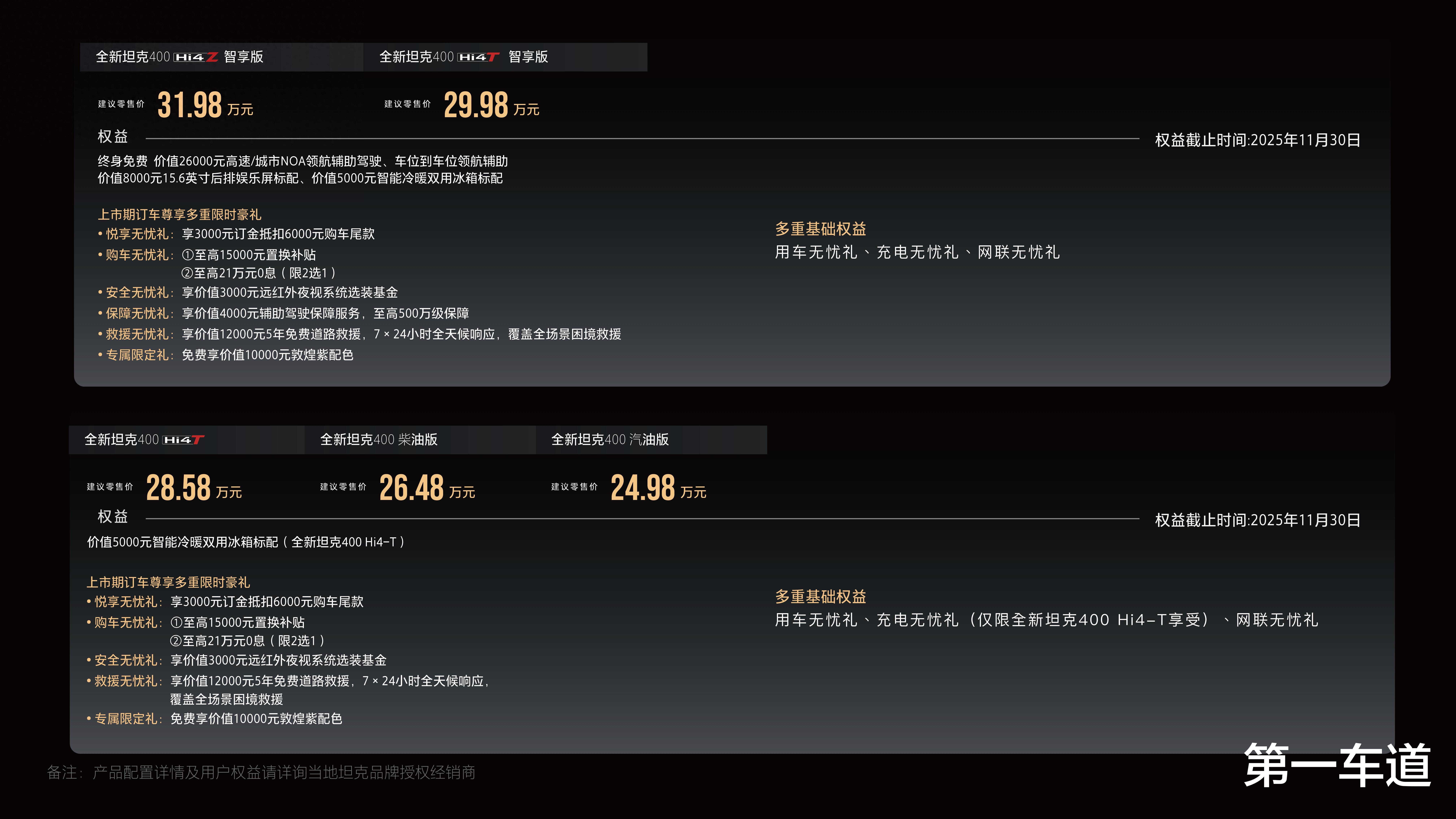 全新坦克400 Hi4-Z智享版,售价31.98万元;全新坦克400 Hi4-T智享版,售价29.98万元;全新坦克400 Hi4-T,售价28.58万元;全新坦克400 柴油版,售价26.48万元;全新坦克400 汽油版,售价24.98万元。