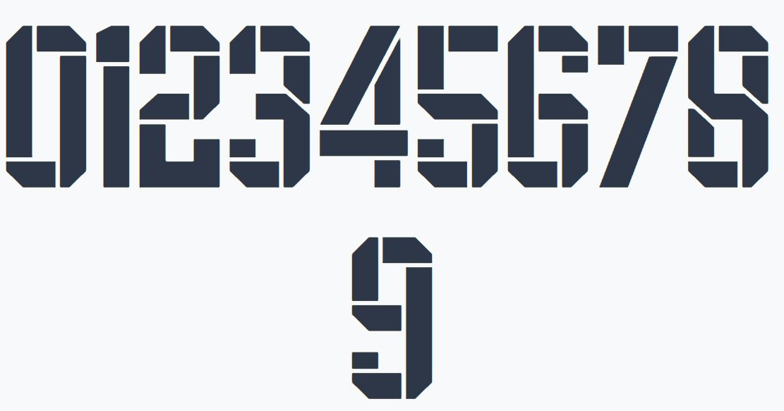 这款字体采用模块化几何解构设计,将数字拆解为独立的几何块面,棱角分明、线条硬朗,是典型的 2020 年代现代球衣字体风格。