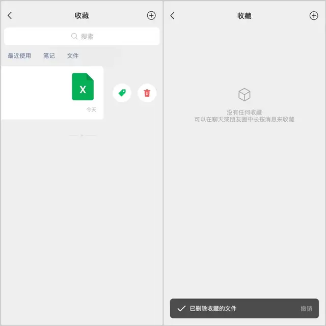 在微信“我-收藏”中,当删除任意收藏内容后,底部会弹出横条弹窗,并提供了一个新按钮“撤销”。