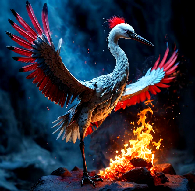 毕方身形似鹤,有着白色的喙,青色的羽毛和红色的斑纹,奇特之处是只有一只脚。