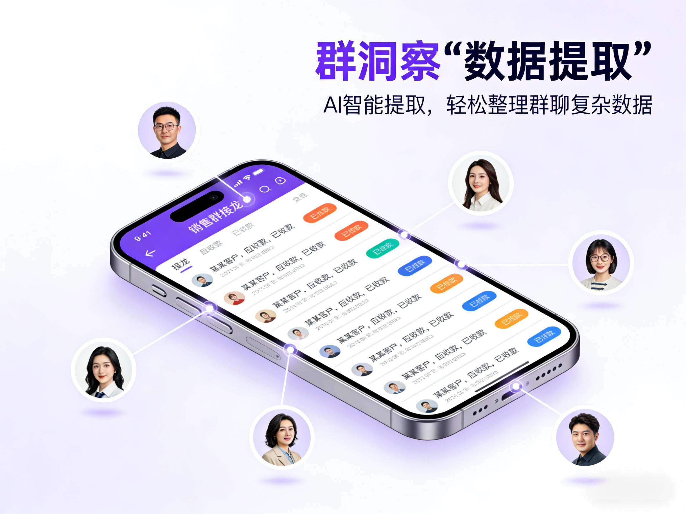 四、 告别传统“接龙”统计,群洞察AI数据提取,复杂信息一键提取“数据提取”这是群洞察最受老板们欢迎的“功能”,它彻底解放了人力,改变了传统的软件接龙,让微信群的数据收集变得简单。: