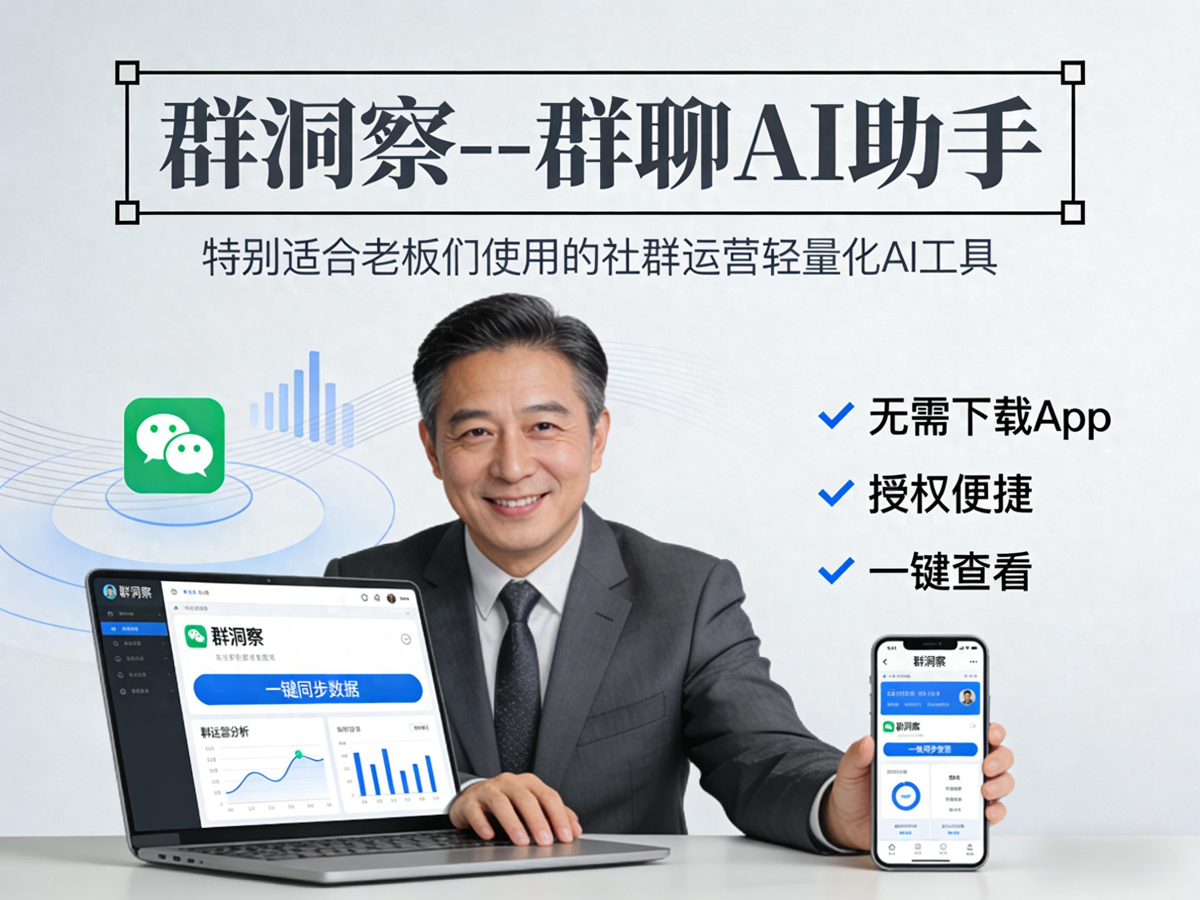 一、无需下载、即插即用,特别适合老板们AI工具很多企业的老板,尤其是40到50岁之间的老板,对新兴的数字工具可能并不太熟悉。传统的软件下载、注册、配置流程复杂,让人望而却步。但群洞察却彻底打破了这一难题。它作为一个微信小程序,直接在微信内操作,无需额外下载任何App,所有数据同步和管理都在后台进行。老板们只需要轻松授权,就可以一键查看群的运营情况,无需复杂的操作和学习曲线。