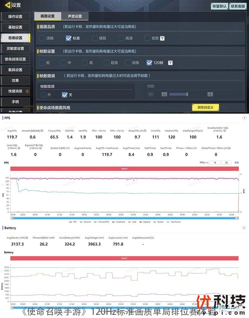 在使命召唤游戏中则是选择了120标准画质进行单局排位赛体验,在没有超级帧率的加持下平均帧率也是达到了119.7Hz,表现还是相当不错的。而平均功耗仅为3.1W,可以看到处理器以及整体优化还是非常可以的。