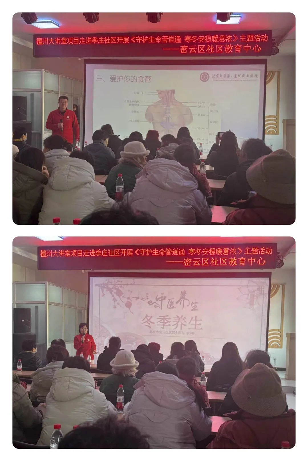 1月15日,“檀州大讲堂”项目首场活动走进密云镇季庄社区,聚焦冬季居民养生需求,开展《守护生命管道通 寒冬安稳暖意浓》主题讲座。密云区医院胸心血管外科主任姚永正结合寒冬气候特点,用通俗易懂的语言讲解人体“生命管道”养护、冬季保暖、常见疾病预防等实用知识;北京市密云区医院中医科主治医师耿明凡分享简单易操作的中医冬季养生妙招,帮助社区居民尤其是老年群体科学养生、安稳过冬,让寒冬里的社区充满温情与关怀。