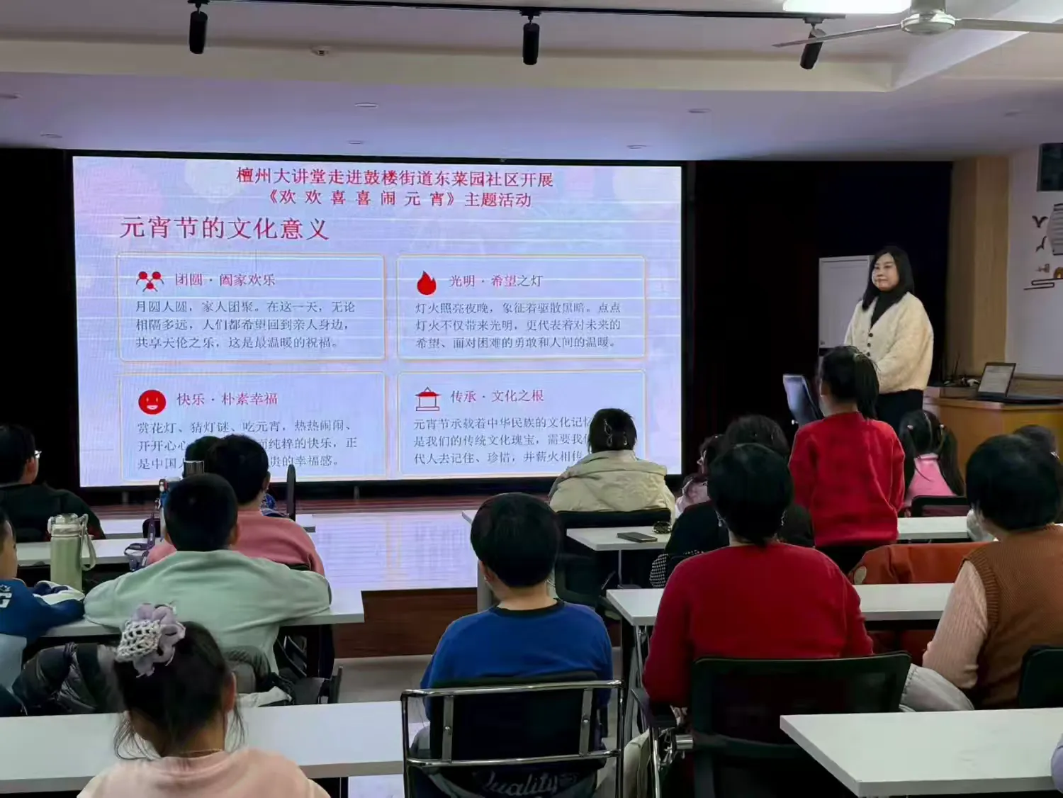 2月26日,“檀州大讲堂”项目走进鼓楼街道东菜园社区,传承元宵节传统习俗,开展《欢欢喜喜闹元宵》主题活动。王雪老师向居民介绍元宵节的由来、传统习俗及文化寓意,组织开展趣味猜灯谜、元宵习俗分享等互动环节,让居民在欢声笑语中感受传统节日的魅力,传承中华优秀传统文化,增进邻里情谊。