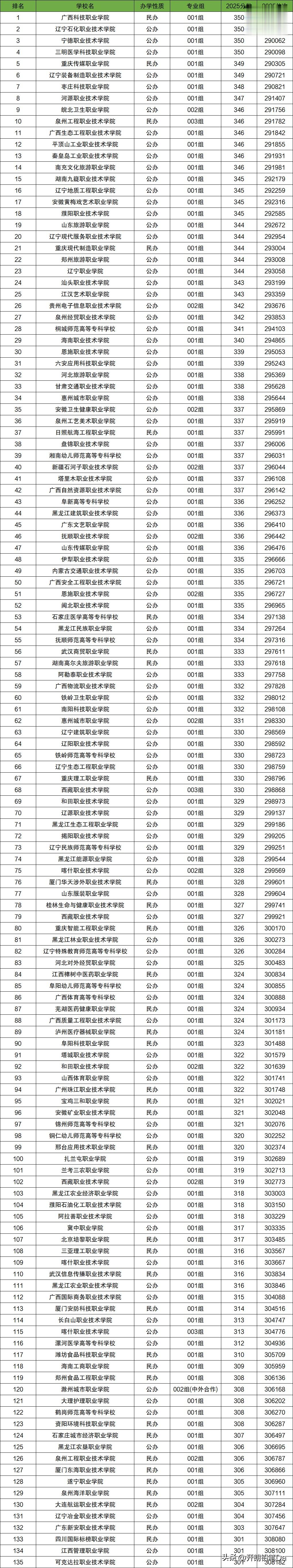 300到350分的专科大学排名下方表格以安徽高考物理类2025年的招生情况为例,展示了全国300到350分的专科大学最低录取分数线排名,共计127所(135个院校专业组),供2026年高考生参考!