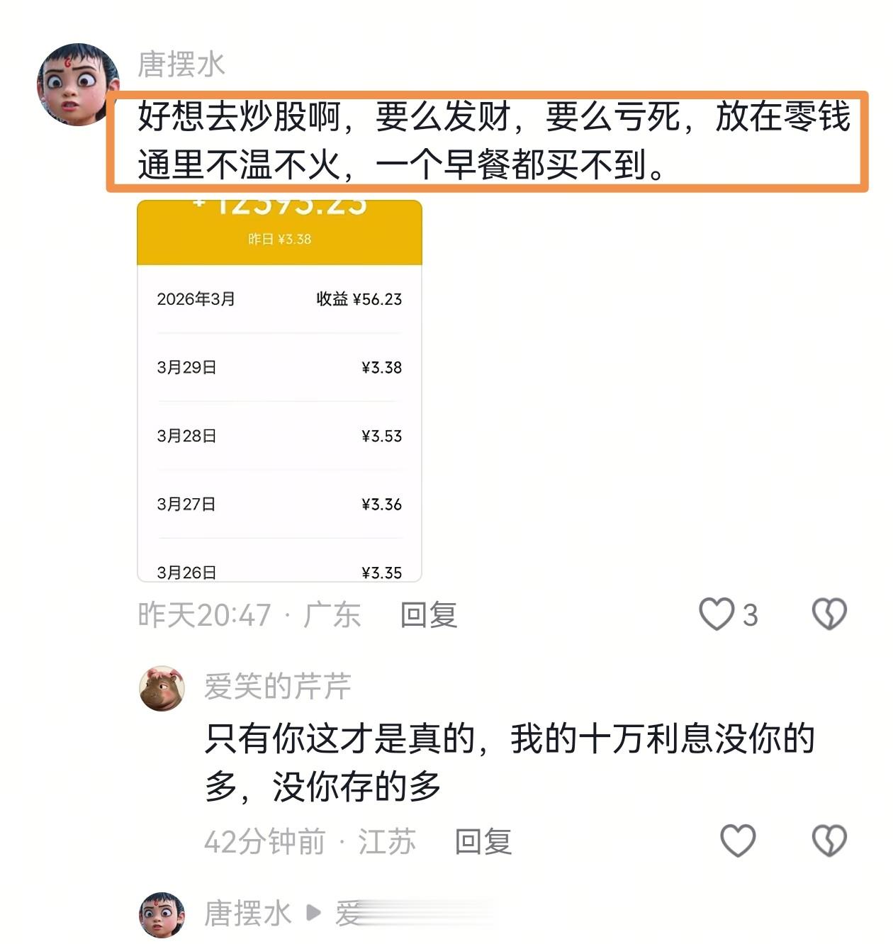 跟你一样的心情,看到很多存款的,心情都不好了[大笑]