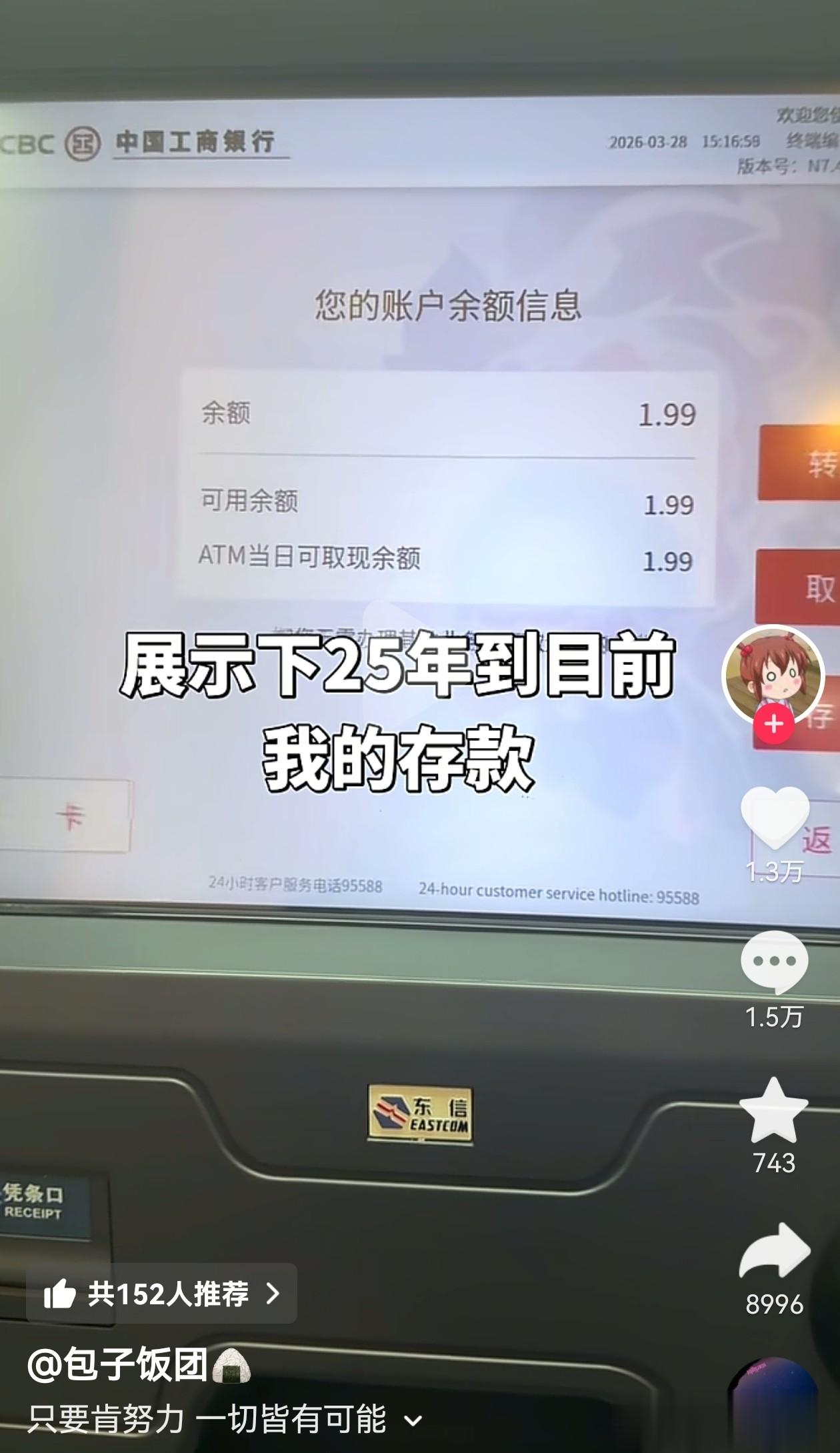 视频里,工商银行ATM机的界面清晰展示着余额、可用余额均为1.99元,连ATM当日可取现余额都精准卡在这个数,没有半点水分。配文那句“只要肯努力,一切皆有可能”,配上这不到两块钱的余额,反差感直接拉满,瞬间戳中无数打工人的心声,短短时间就冲上热搜。