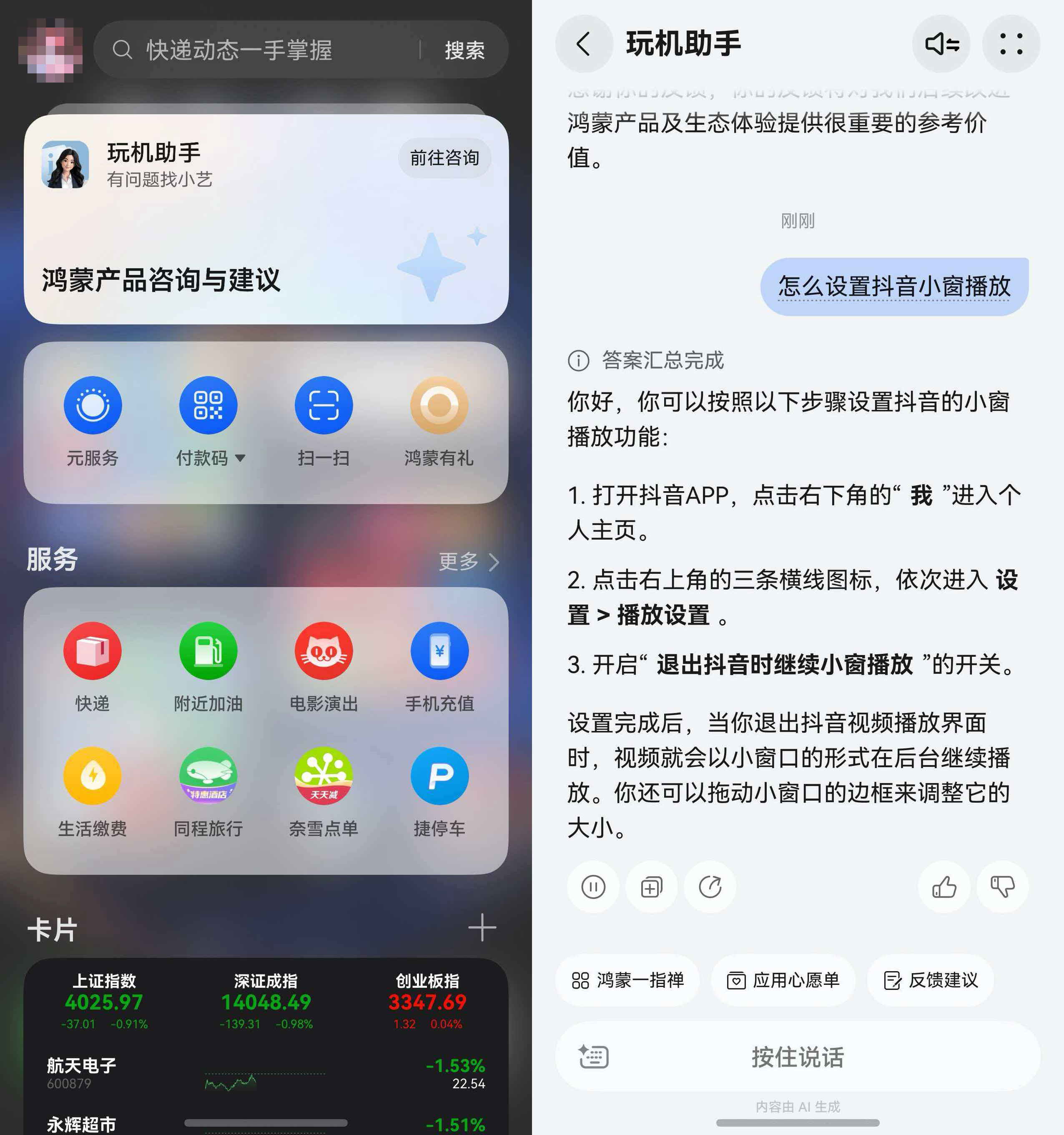 咱们平时要是在玩机上有其他问题,都可以“问问小艺”,就是从桌面往右滑进负一屏,找到“鸿蒙产品咨询与建议”入口,点进去就找到小艺啦,它可以帮你解决用机问题,还能点击“反馈建议”帮助鸿蒙生态更加完善。现在鸿蒙系统用起来是越来越顺手,也真心期待更多应用能赶紧上线鸿蒙版,等生态慢慢完善了,大家用着才能更省心呀!