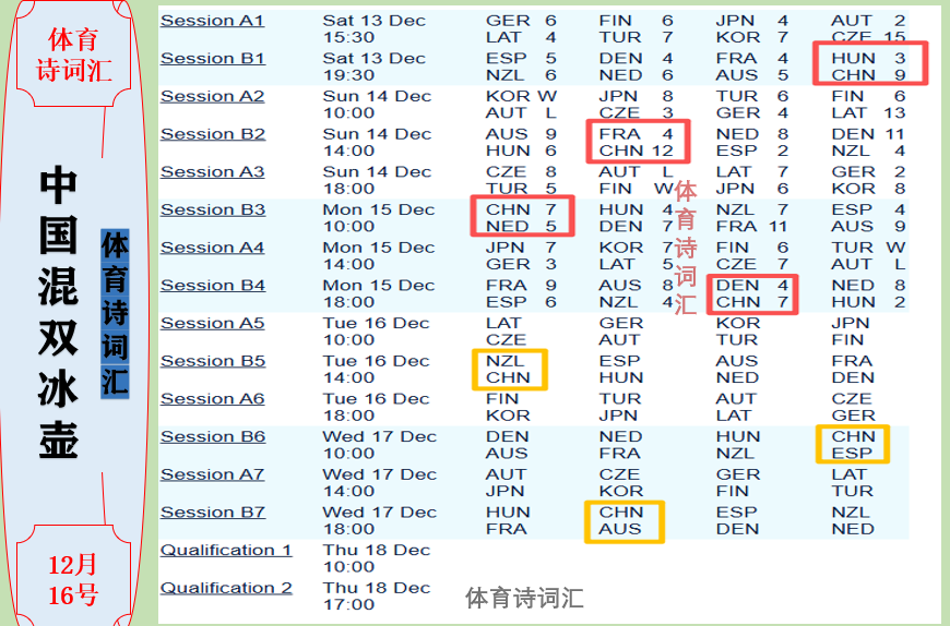 本轮其余比赛结果为:法国9-6西班牙、澳大利亚8-4新西兰、荷兰8-2匈牙利、日本7-3德国、韩国7-5拉脱维亚、芬兰6-7捷克、土耳其胜奥地利。