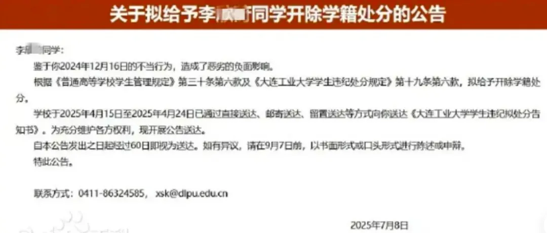 大连工业大学最终以“与外国人不正当交往,有损国格、校誉”为由,对她作出开除处分。