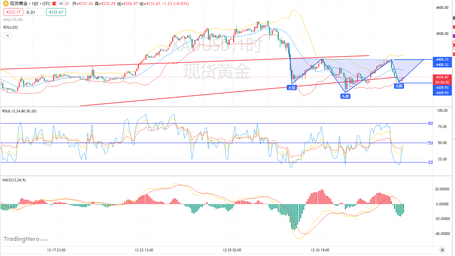 从1小时图看,黄金已形成头肩底结构,右肩底部位于4310附近,颈线则落在4400一线。形态完成后通常预示价格向上突破,因此预计明日开盘金价有望延续上行。