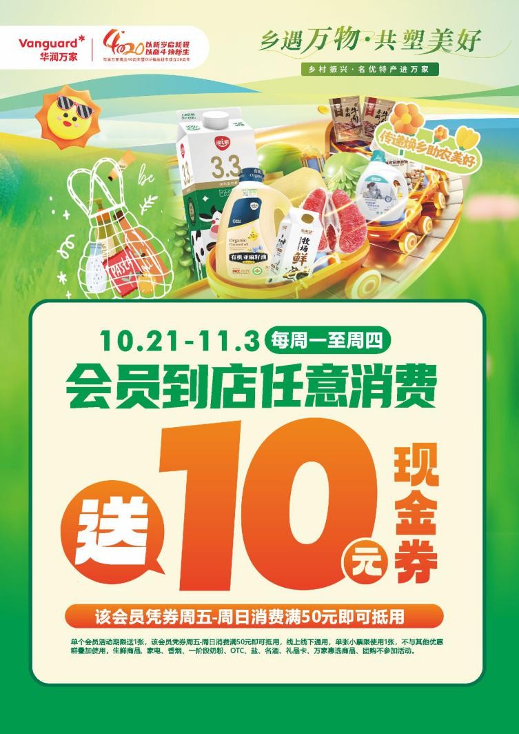 此外,华润万家还额外提供了10元优惠券,即日起-11月3日,每周一至周四会员到店任意消费即送10元现金券,单个会员活动期限送1张,该会员凭券周五-周日消费满50元即可抵用,线上线下通用。